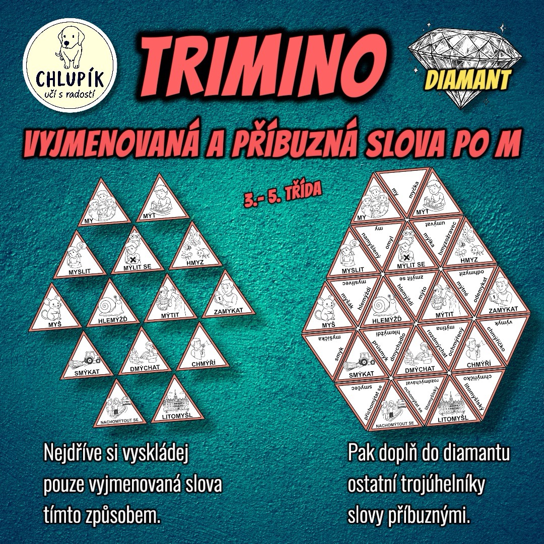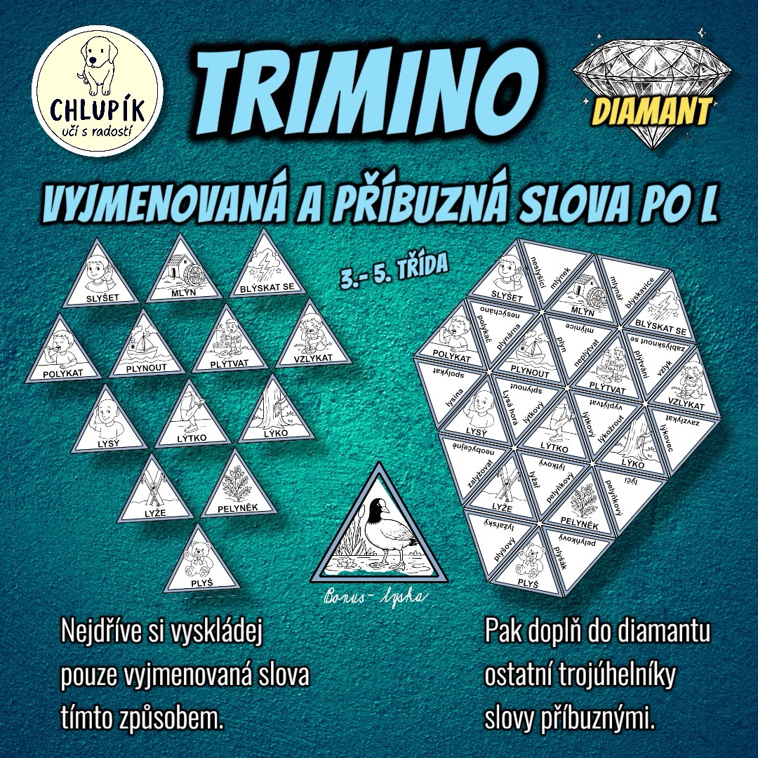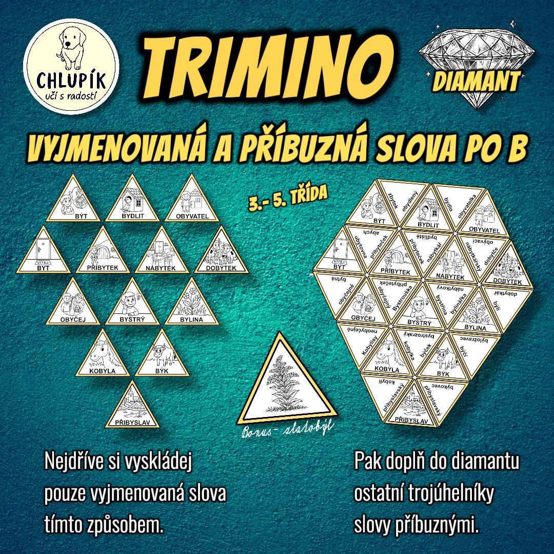 Procvič si vyjmenovaná slova po B, L a M hravě! Pomocí obrázkového trimina nejdříve poskládáš vyjmenovaná slova do tvaru diamantu, poté doplníš další trojúhelníky s příbuznými slovy. Na konci tě čeká hotový drahokam znalostí. 💎