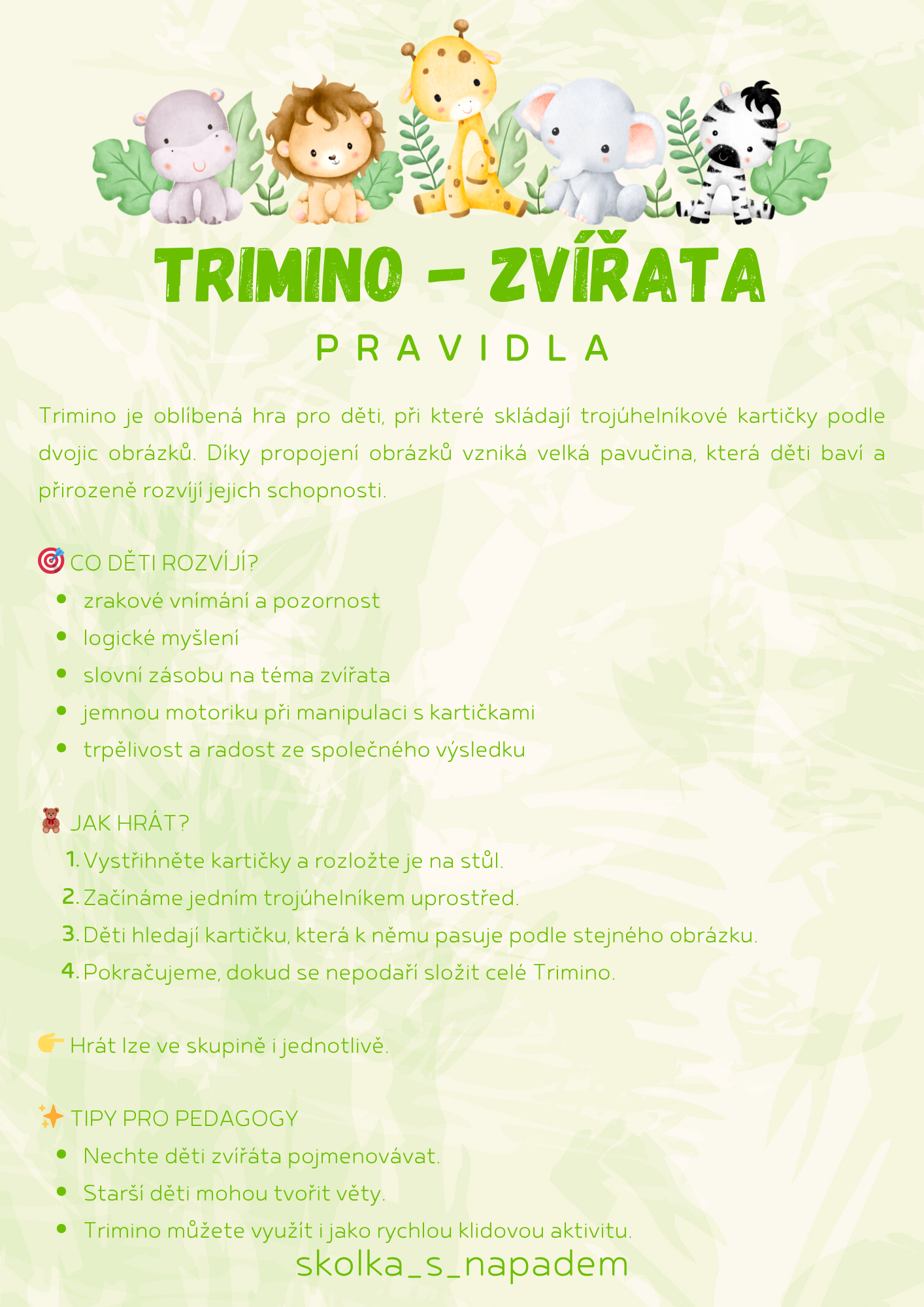 Každé trimino funguje na principu trojúhelníkového domina: dítě hledá správné dvojice obrázek–slovo / slovo–slovo / obrázek–obrázek (dle sady) a skládá z nich celek.