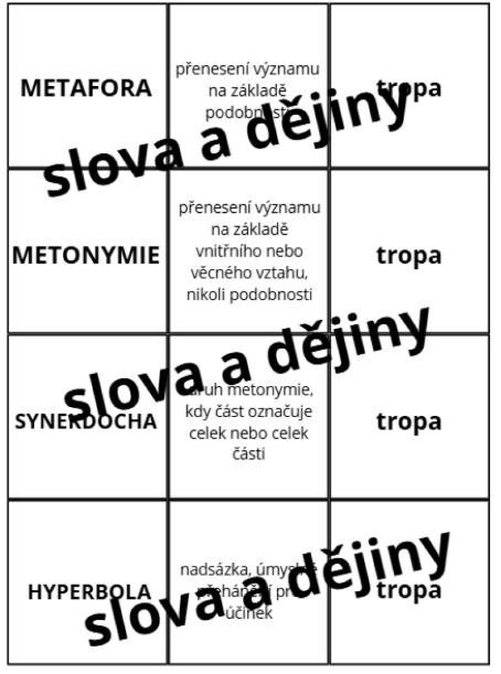 - Teoretický základ: Každý pojem obsahuje stručnou a srozumitelnou definici (např. litotes jako negace opaku, synekdocha jako vztah části a celku).