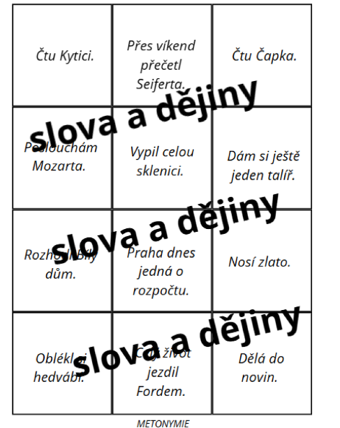 - Přiřazování: Rozstříhejte tabulky s příklady a nechte studenty určovat, o jaký umělecký prostředek se jedná.
