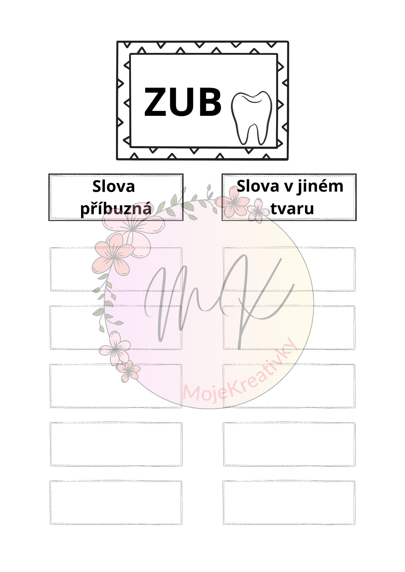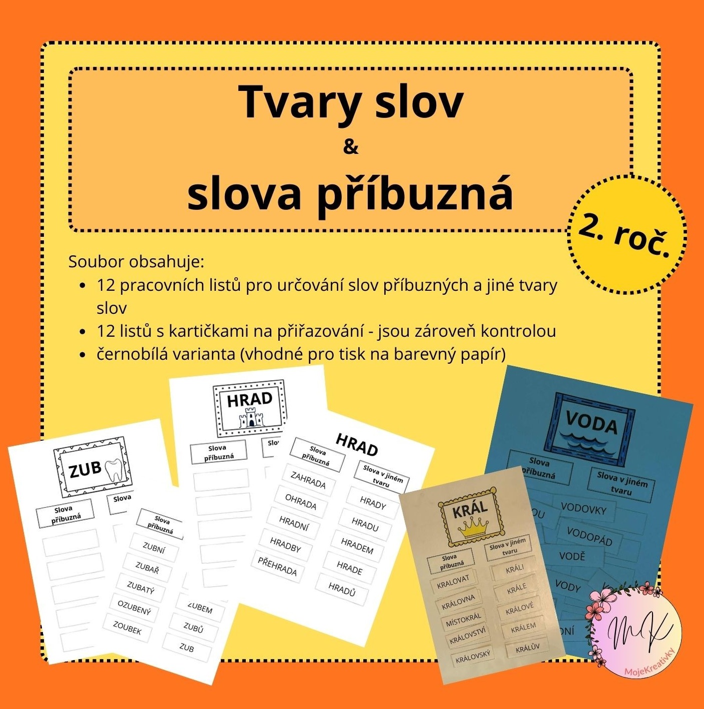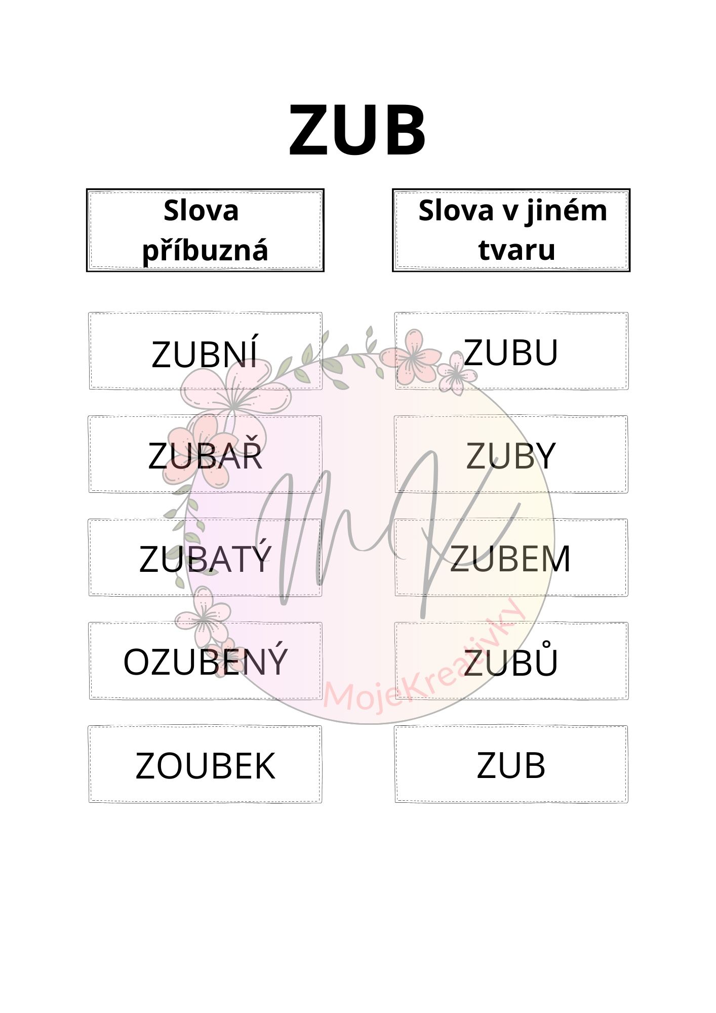Celkem 12 pracovních listů, které obsahují jedno základní slovo, okýnka pro rozřazení slov na slova příbuzné či jiný tvar daného slova (celkem 10 slov na přirazení).