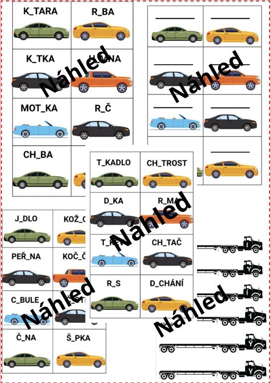 Obsah materiálu: Karty s kamiony a 32 kartiček s auty. Karty připravené pro vlastní tvorbu. Řešení.