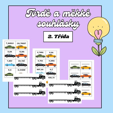 Postup při použití: Rozdejte žákům jednotlivě nebo do skupinek kamiony na přepravu aut a kartičky s auty. Žáci na kamiony skládají slova podle označení kamionu. Pokud má kamion označení “Y”, žáci mu skládají na návěs auta se slovy, ve kterých chybí právě “Y”. Pro kontrolu si mohou práce zkontrolovat s jinými skupinami nebo jednotlivci. Prázdné kartičky s auty slouží k vlastní tvorbě. Žáci si mohou vymýšlet slova, která by na kamiony patřila.