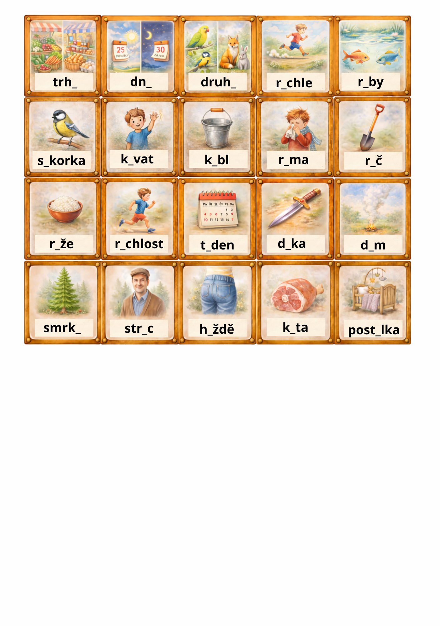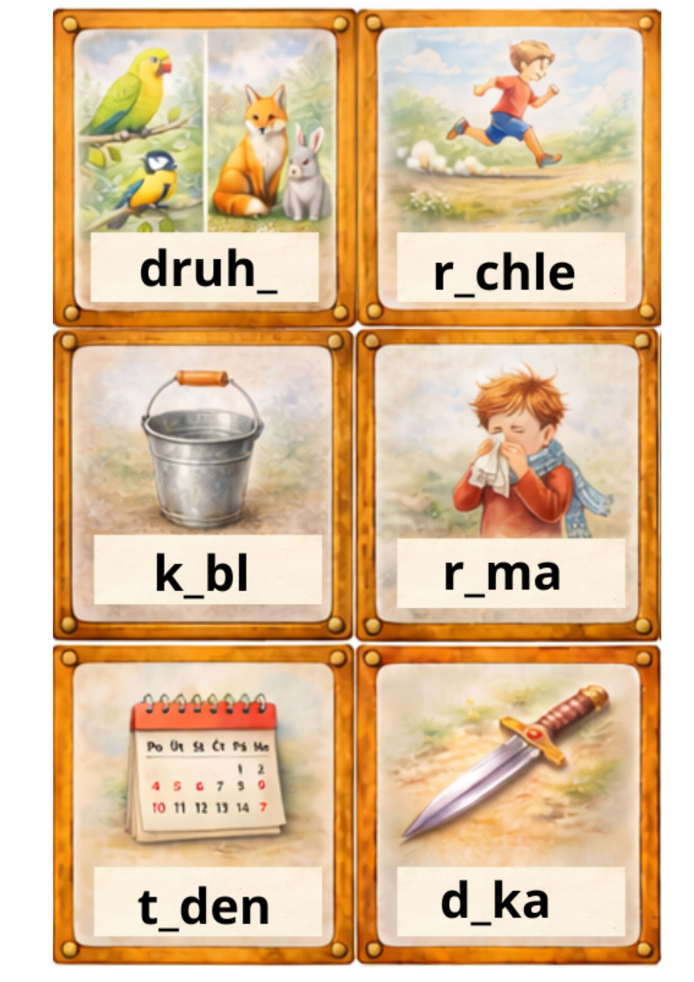 Dítě si vybere kartičku, doplní chybějící písmeno a vloží ji do správného domečku.