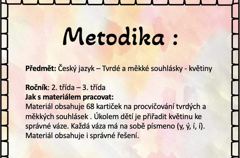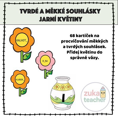 Materiál obsahuje 68 kartiček na procvičování tvrdých a měkkých souhlásek . Úkolem dětí je přiřadit květinu ke správné váze. Každá váza má na sobě písmeno (y, ý, í, í).