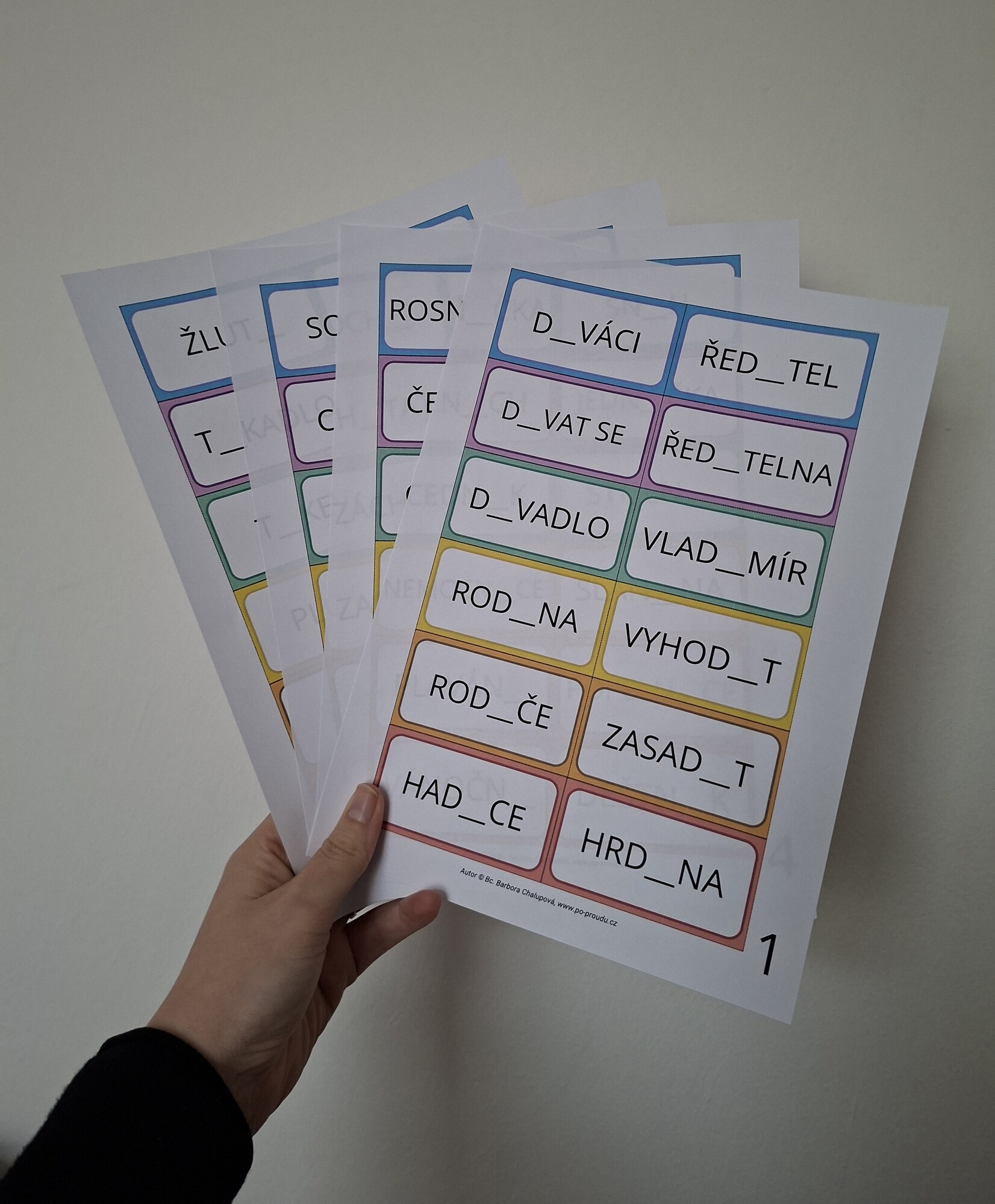 Rozsáhlý soubor 384 kartiček pro systematické procvičování pravopisu tvrdých a měkkých souhlásek. Materiál je navržen tak, aby byl maximálně flexibilní, opakovaně využitelný a přirozeně zapojitelný do běžné výuky – od krátkých doplňovaček až po pohybové a skupinové aktivity.