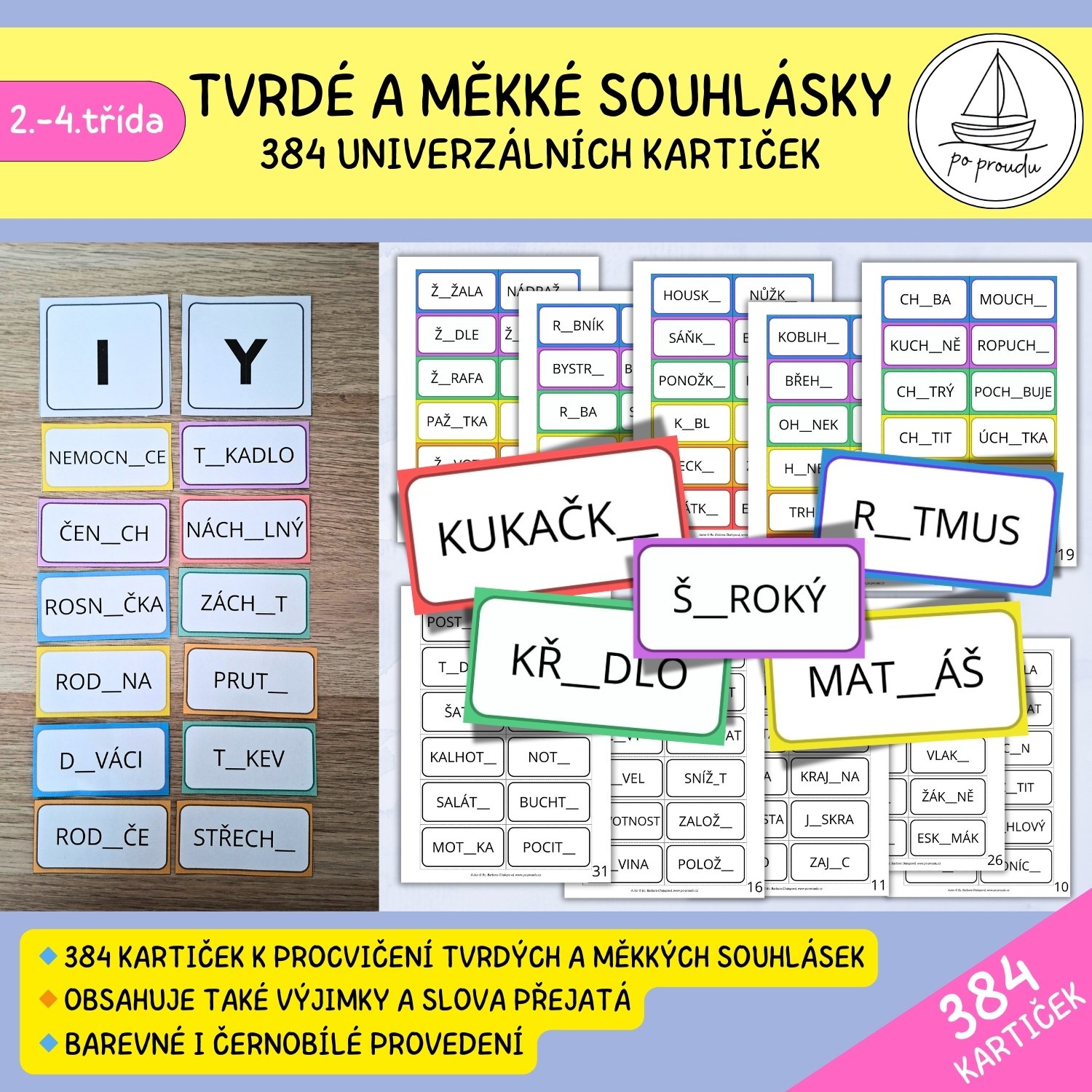 Praktická sada 384 kartiček pro rychlé a opakované procvičování tvrdých a měkkých souhlásek – ve třídě i na stanovištích. 💡