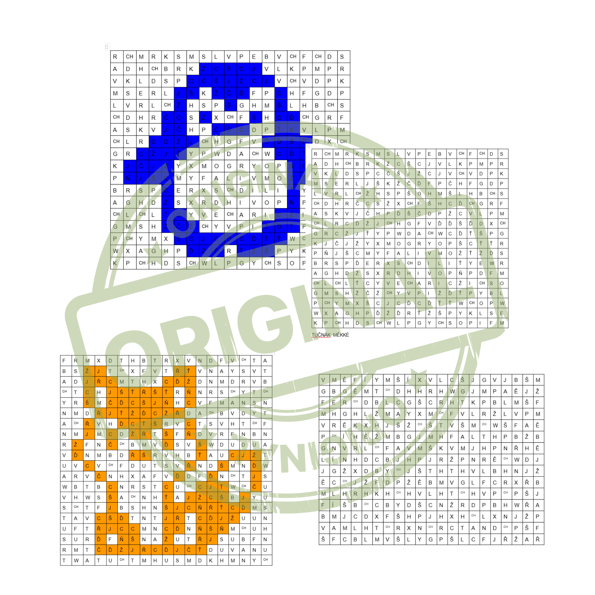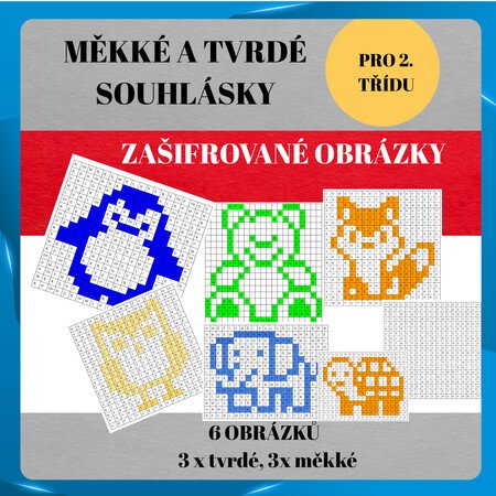 Materiál obsahuje šest zašifrovaných obrázku na procvičení měkkých a tvrdých souhlásek. 3 obrázky se soustředí na rozpoznání tvrdých souhlásek H CH K R D T N, 3 obrázky cílí na souhlásky měkké Ž Š Č Ř C J Ď Ť Ň. Děti vybarvením správných políček získají obrázek zvířete.