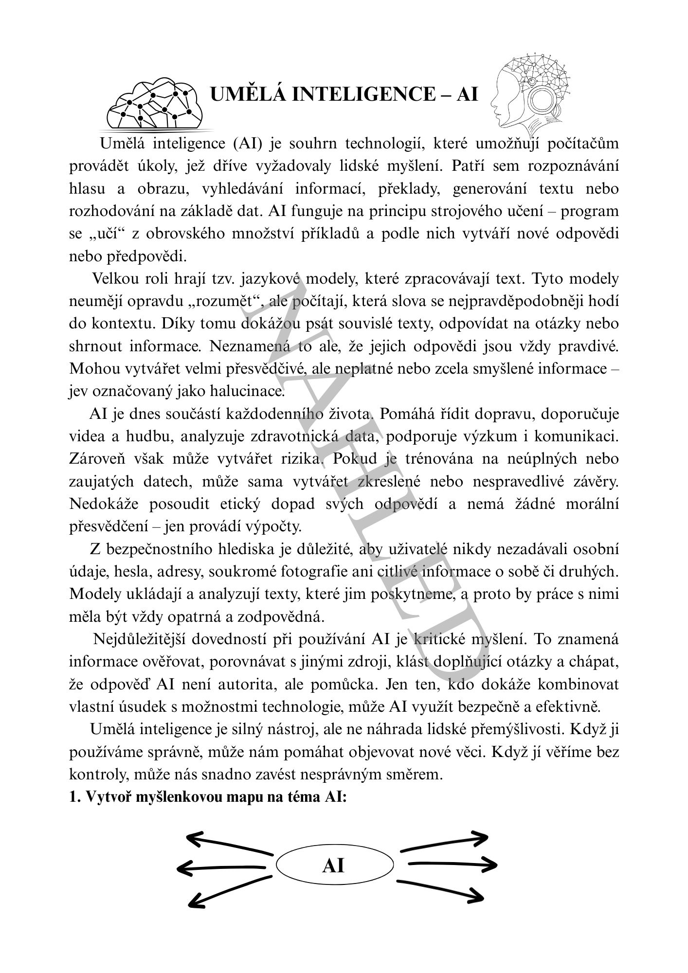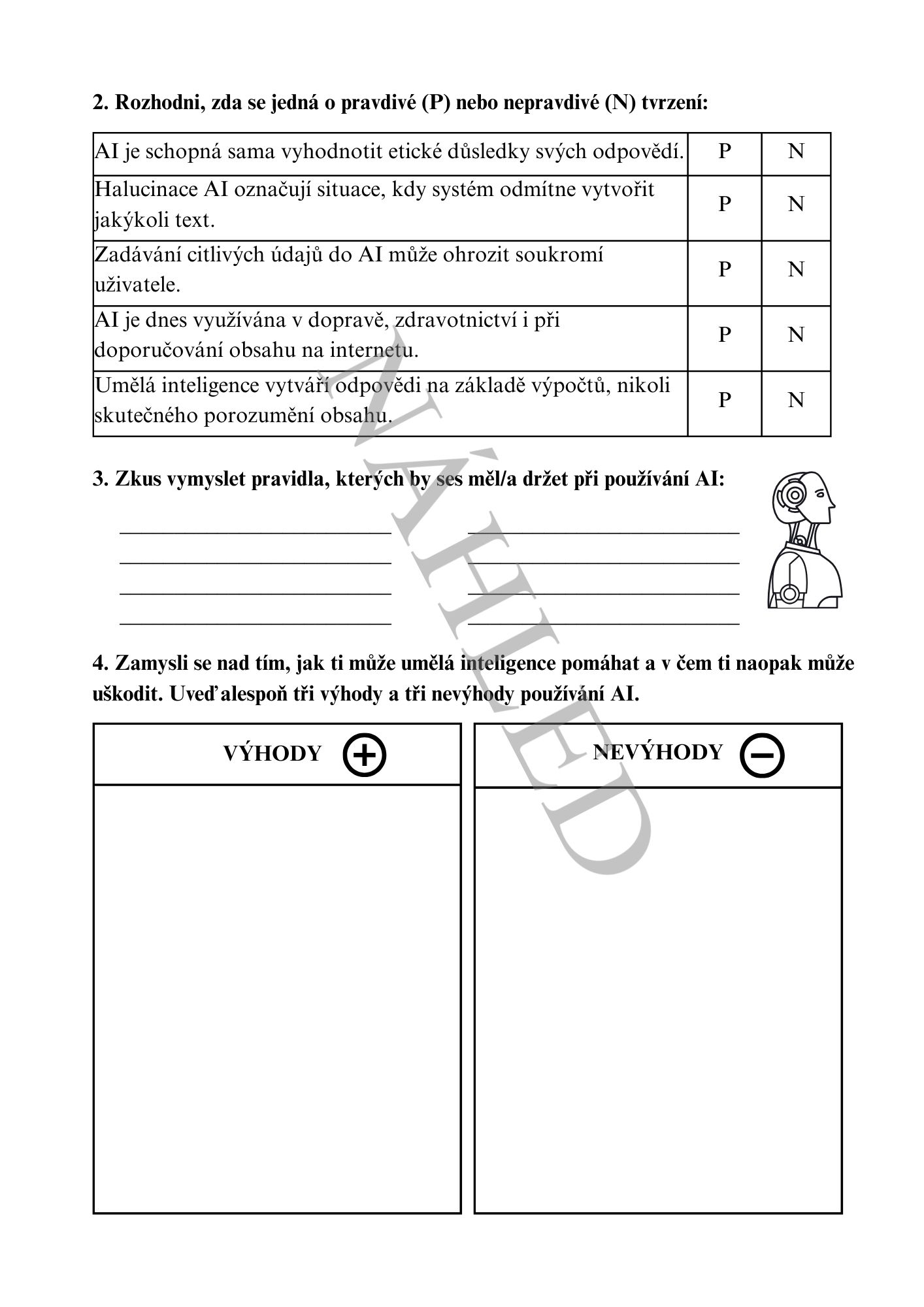 Pracovní list – úkoly zaměřené na porozumění textu, rozhodování o pravdivosti tvrzení, formulaci vlastních názorů a výhody a nevýhody používání AI.