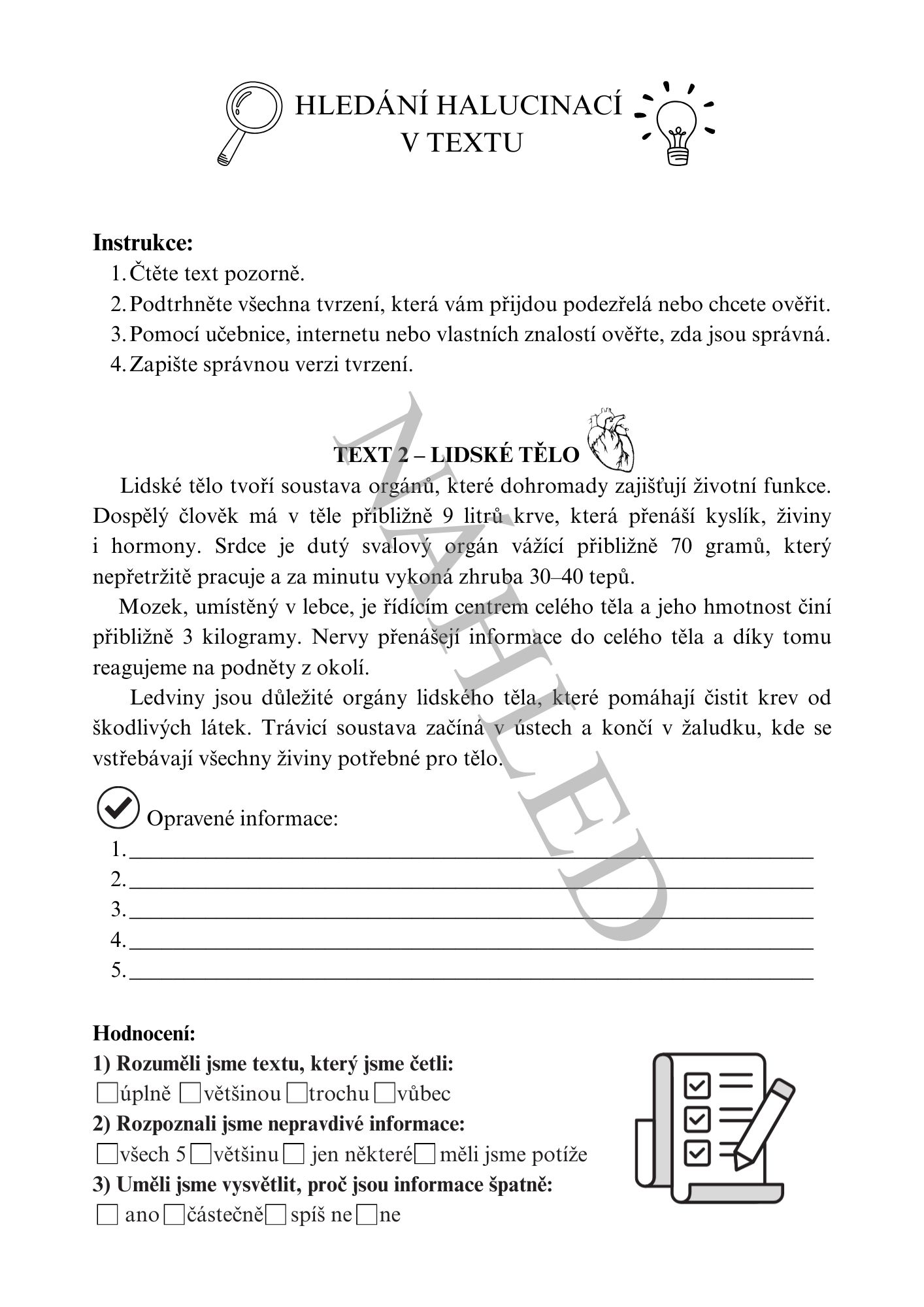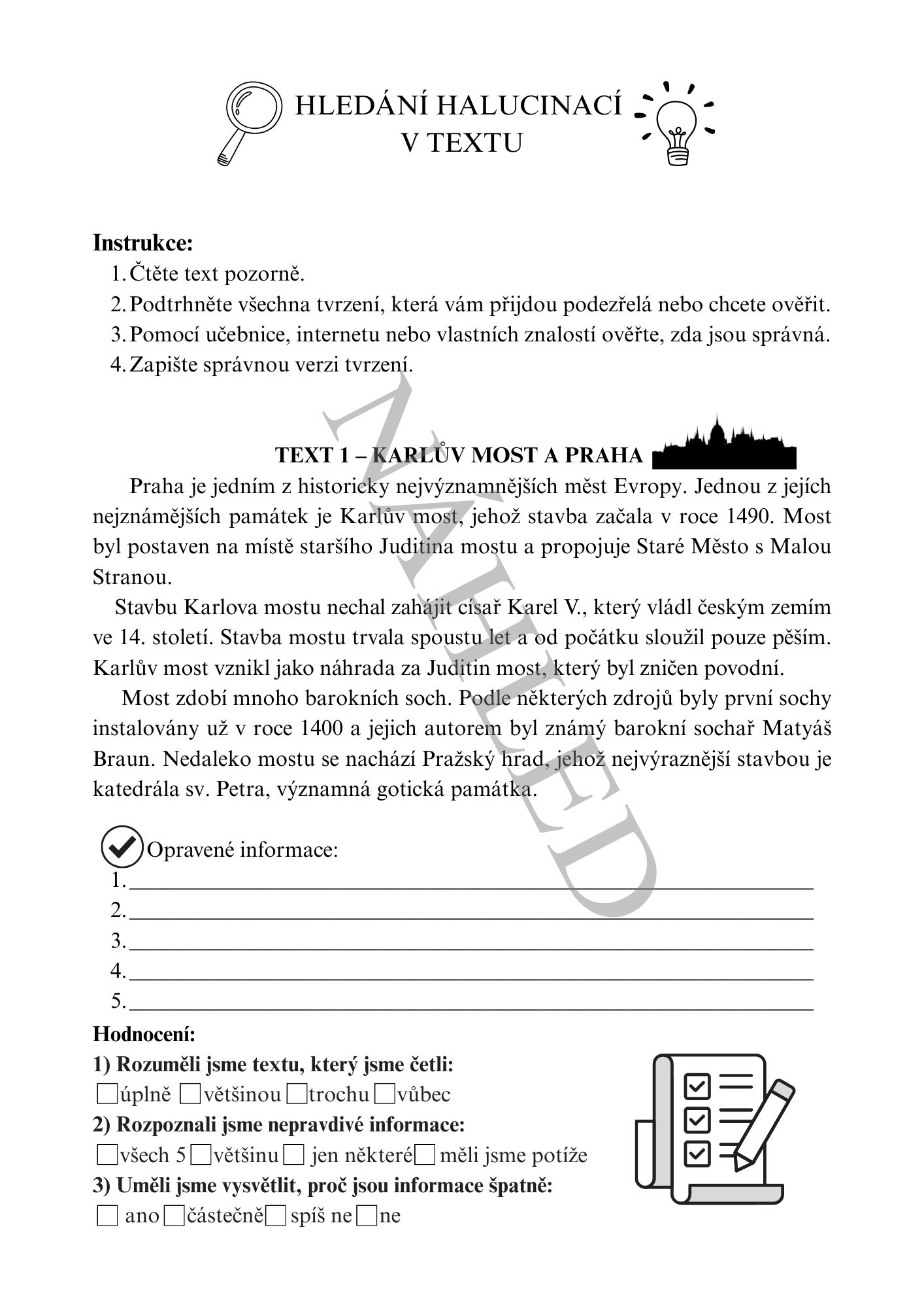 Texty k práci ve skupinách – pět tematických textů, ve kterých žáci vyhledávají správné a nepravdivé informace, učí se ověřovat fakta a rozpoznávat nepřesnosti. Lze pracovat také tak, že si každý žák vybere text, který ho zajímá a pracuje individuálně. Témata: Karlův most a Praha, Lidské tělo, Evropa a státy, Technologie a vynálezy a Sluneční soustava.