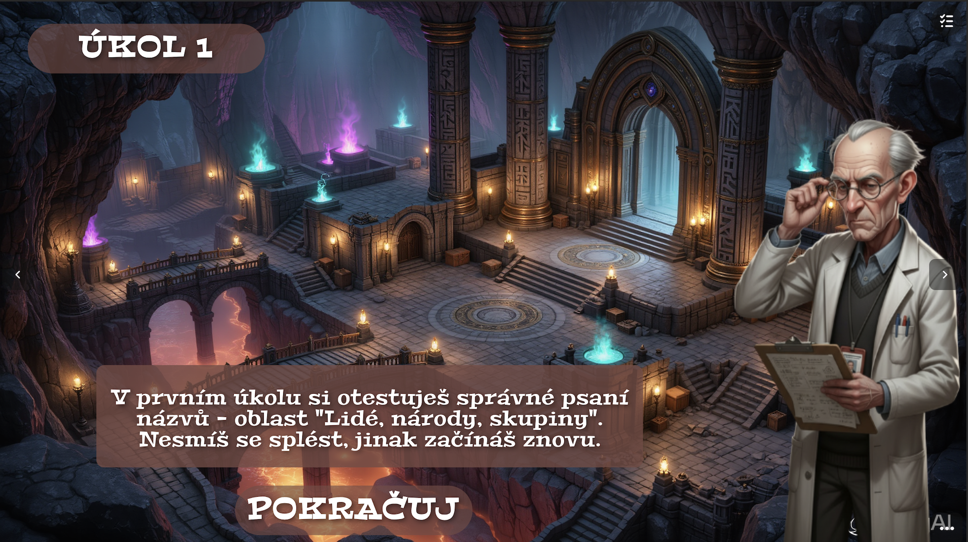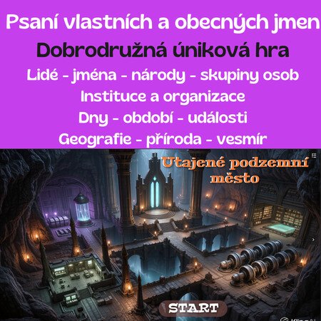 Rád bych vám představil tuto dobrodružnou online hru do češtiny. Je zaměřena na pravopis vlastních a obecných jmen. Doporučuji podívat se na zrychlenou video ukázku. Obsahuje 5 hlavní části, ve kterých jsou další úkoly.