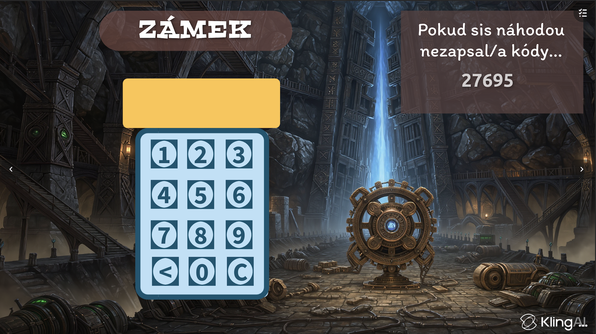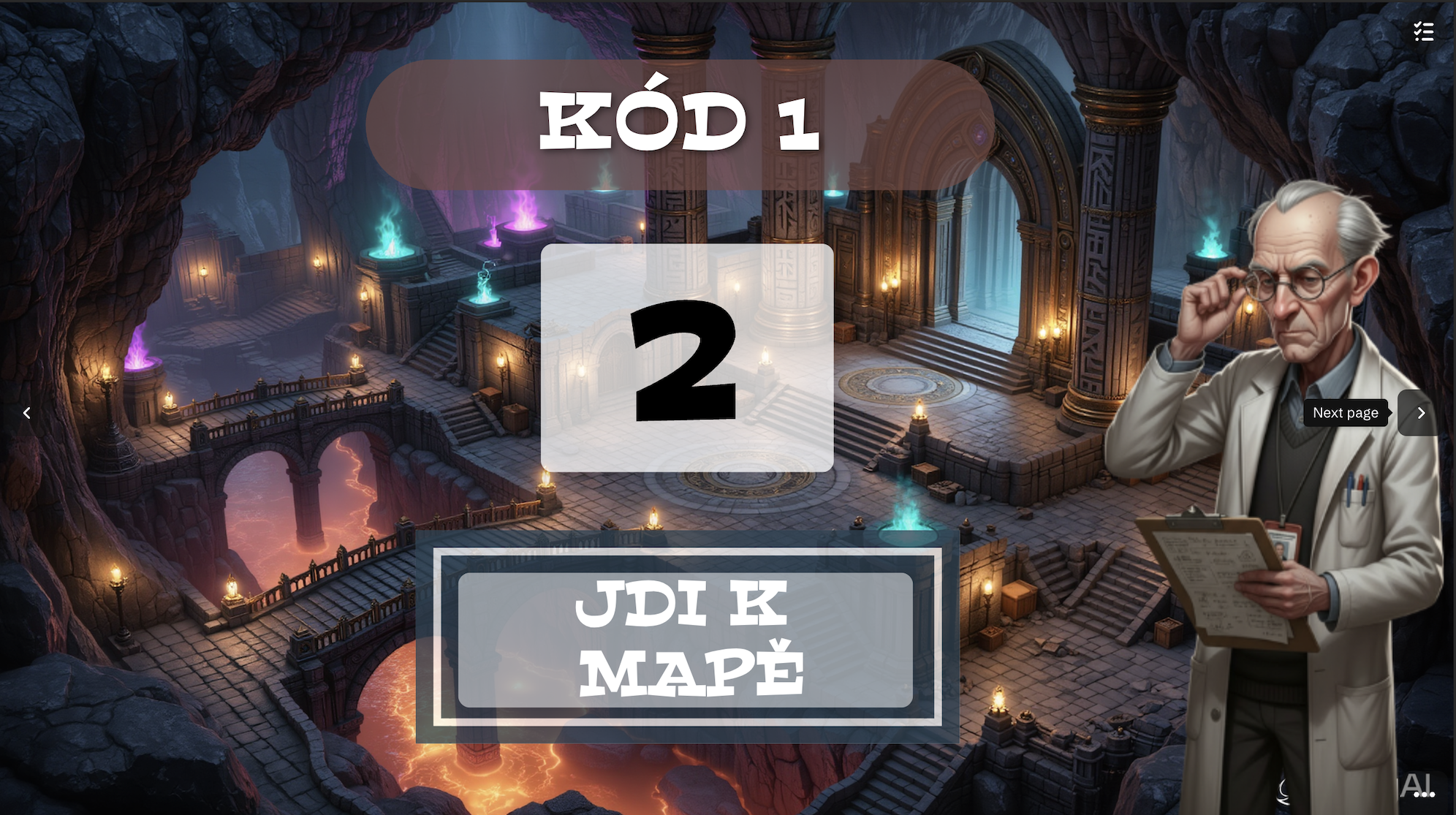 Závěr - po splnění všech úkolů se žákovi na mapě objeví starý vědec, kliknutím na něj se dostane k zámku. Zadá kód (každý hráč má jiný náhodně generovaný), odemyká a otevírá východ z podzemního města.