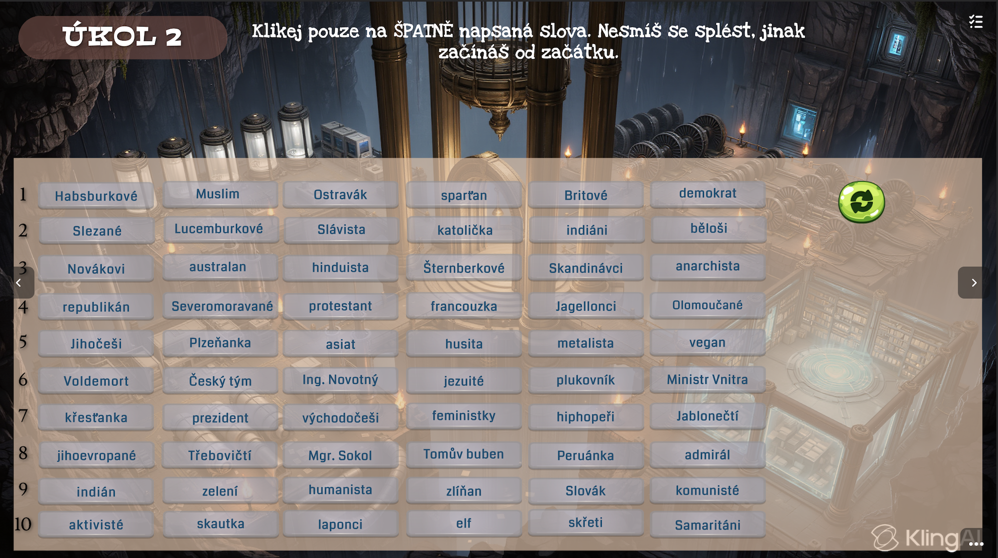 Celkem 60 názvů - v každém řádku musí žák vybrat jedno špatně napsané slovo. Pokud se splete, začíná od začátku.