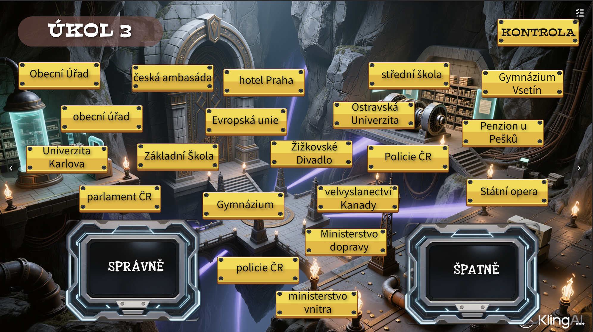 Žák musí splnit 2 cvičení a má na každé časový limit 1 minuta. V obou cvičeních kliká pouze na správně naspané názvy (vždy 6 správných a 3 špatné). Názvy jsou náhodně rozmístěné u každého žáka. Pokud se splete, začíná znovu a názvy se přeskupí a některé i změní.