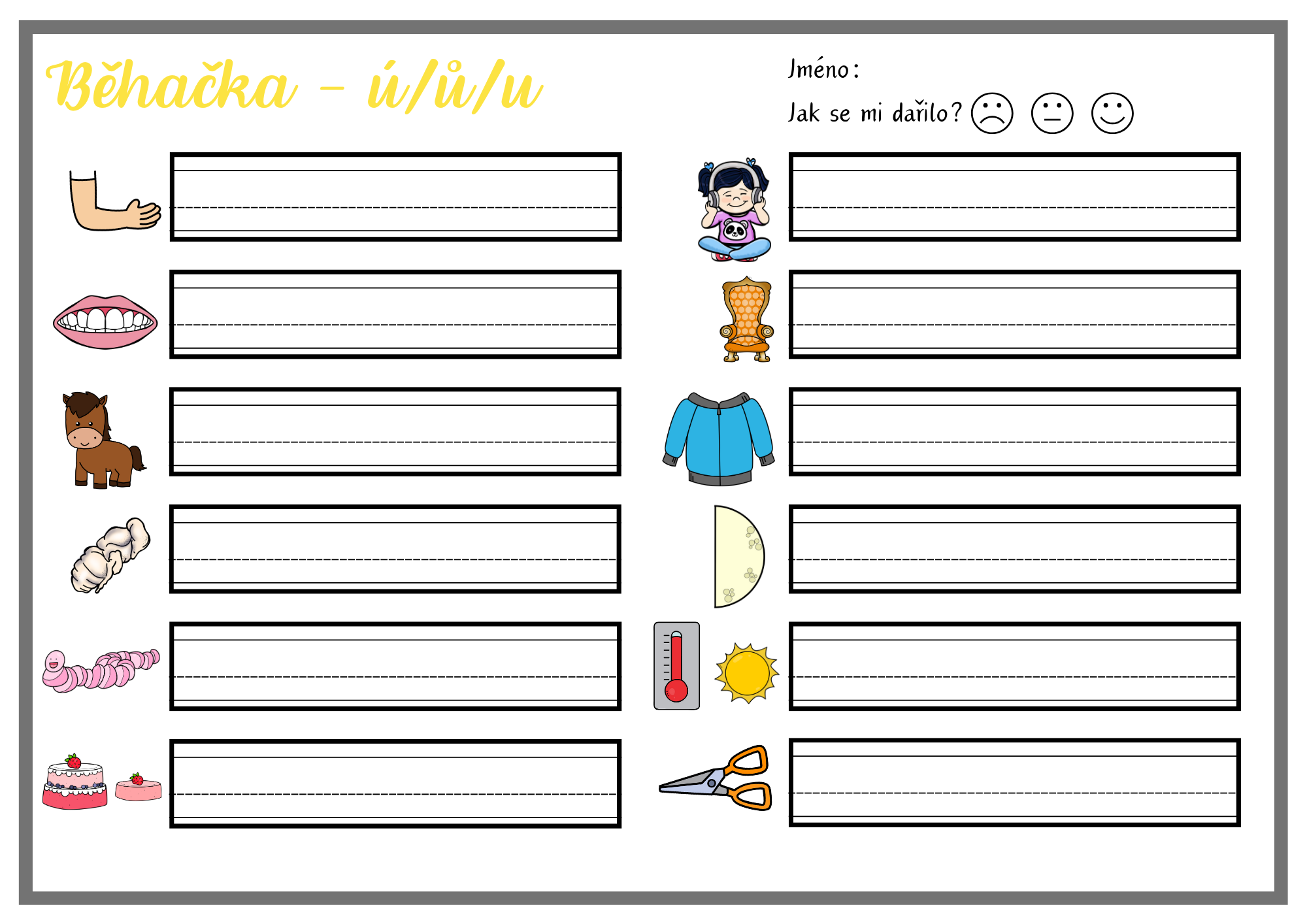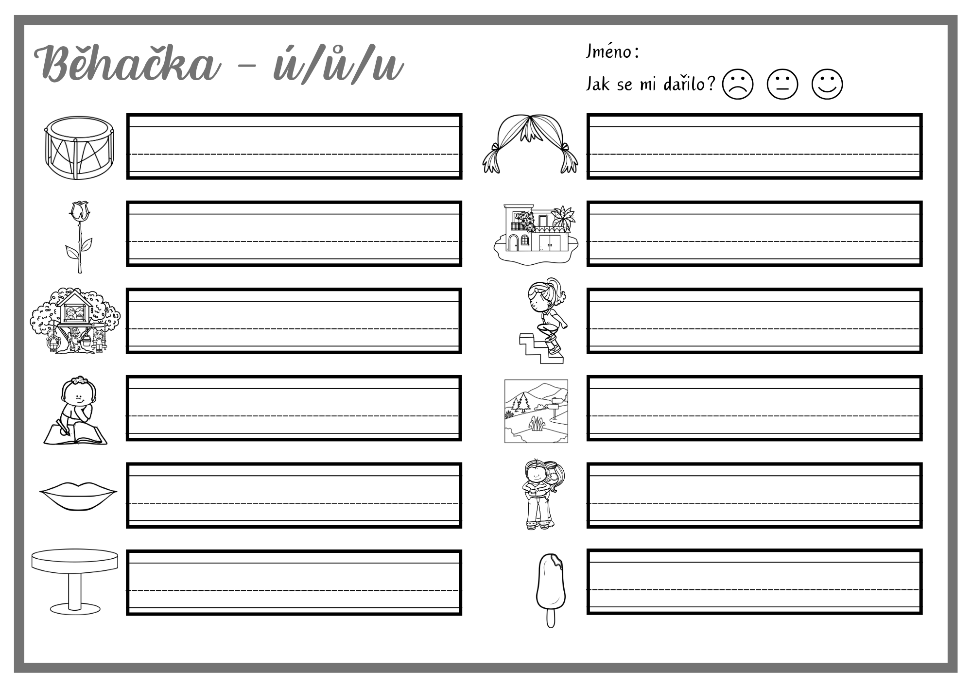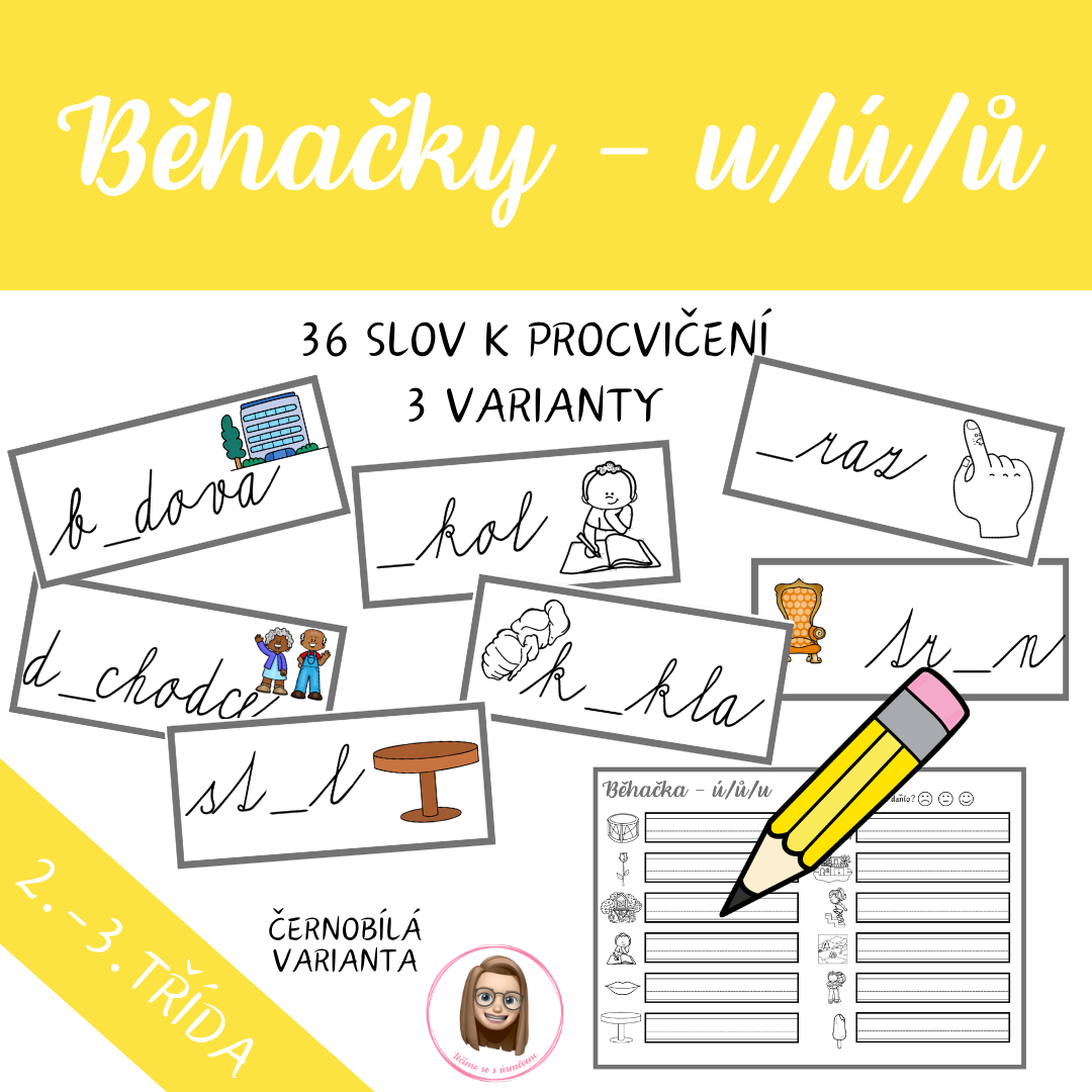 - 12 kartiček na doplnění ů (barevná + černobílá verze)