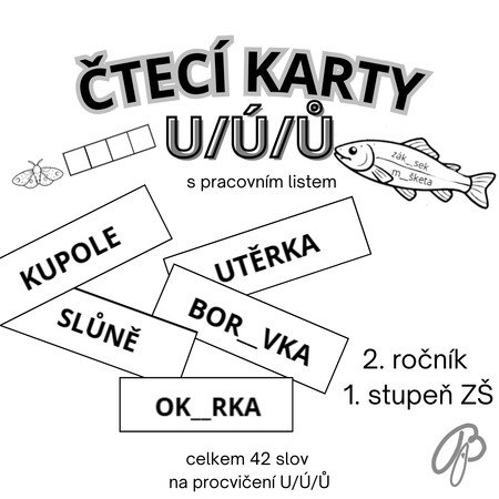 Čtecí karty Ú/Ů/U – slouží jako usnadnění přípravy. Na každém listu jsou tři sloupce, každý obsahuje 7 slov s daným písmenem (U/Ú/Ů), z druhé strany je totéž slovo s chybějícím písmenkem. Celkem tedy 42 slov obsahující u/ú/ů. Materiál můžete zalaminovat, karty rozstříhat. Žáci si nejprve upevní správný zápis slova, poté mohou pracovat s kartou bez doplněného písmene. Vhodné pro ČERNOBÍLÝ tisk.