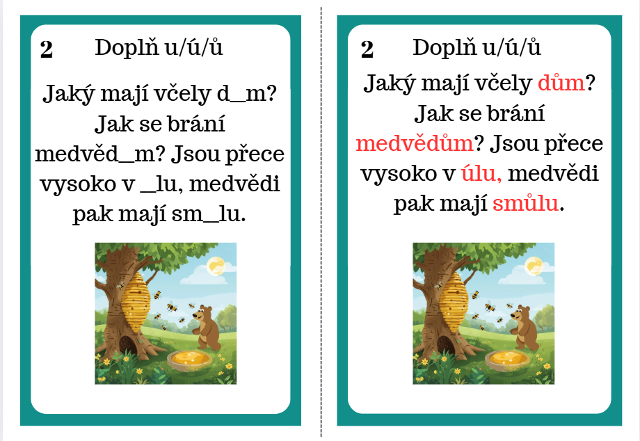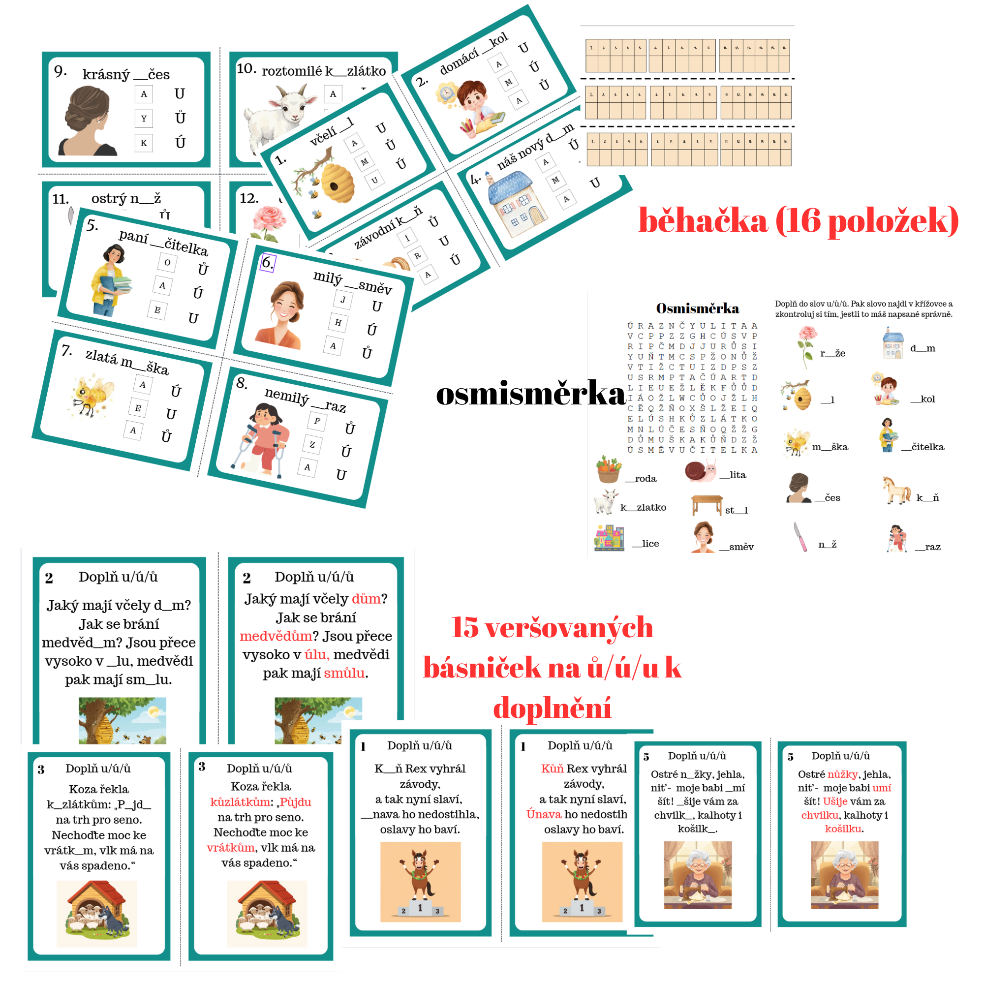 Soubor obsahuje 15 oboustranných kartiček s krátkými básničkami zaměřenými na u / ú / ů. Děti doplňují správné tvary a pomocí řešení na zadní straně si samy ověřují správnost odpovědí.