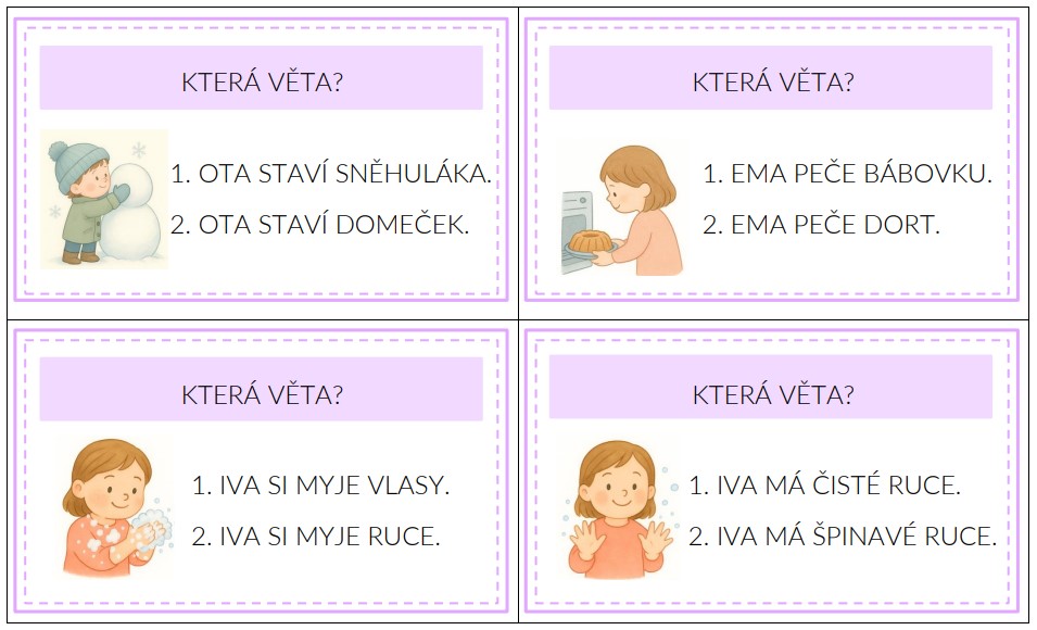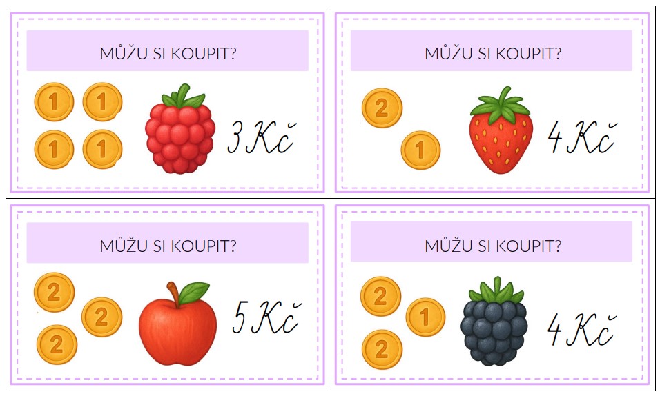Každá kartička má na zadní straně správné řešení – děti si tak mohou úkoly samy zkontrolovat, což podporuje jejich samostatnost i sebevědomí.
