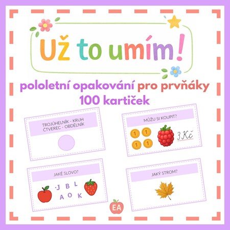 Tato pomůcka je určena k hravému zopakování učiva, se kterým se prvňáci setkávali během prvního pololetí. Jde hlavně o upevnění učiva a posílení jistoty v tom, co už děti zvládají. Nabízí 100 úkolů z oblasti matematiky, českého jazyka a prvouky.