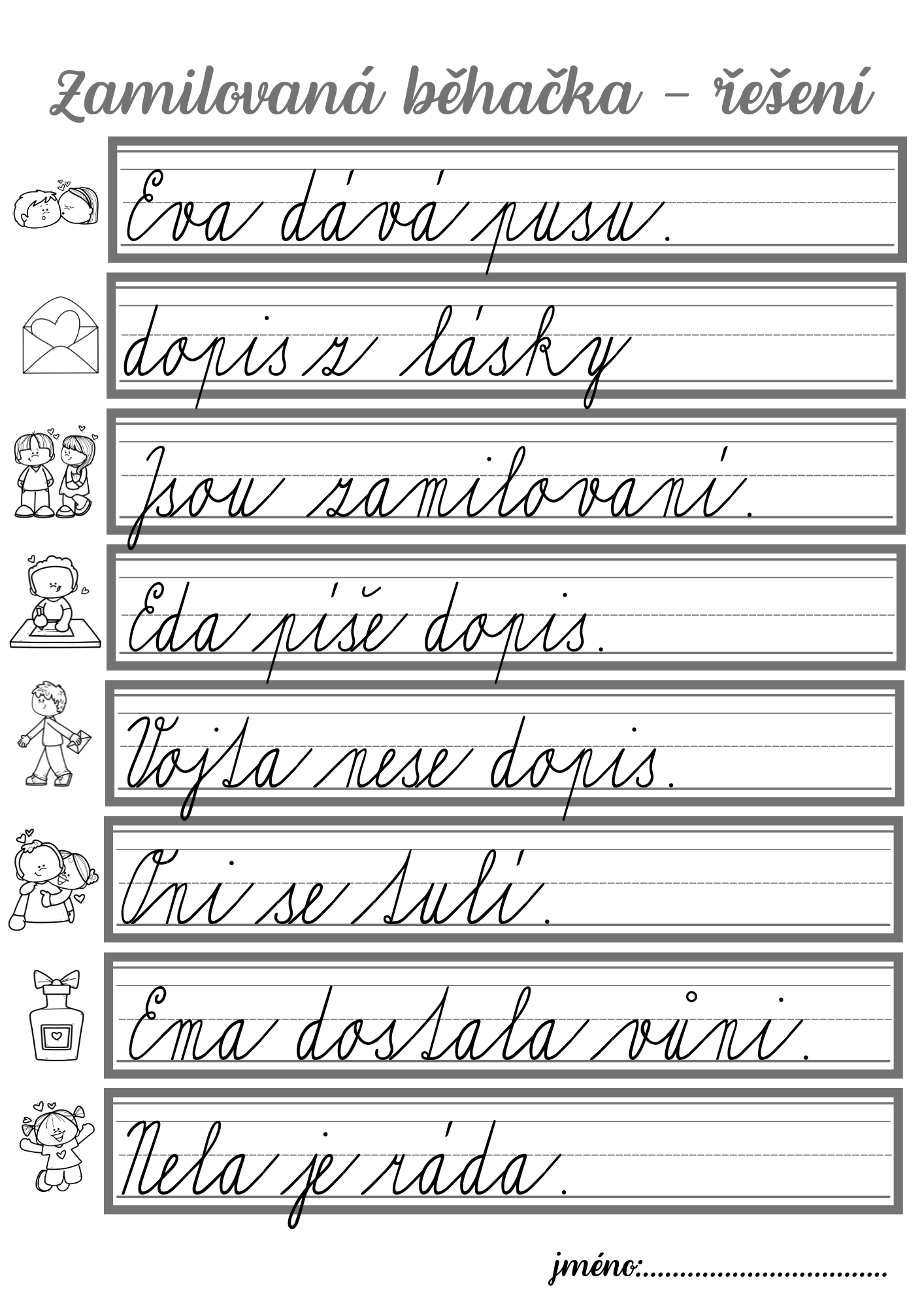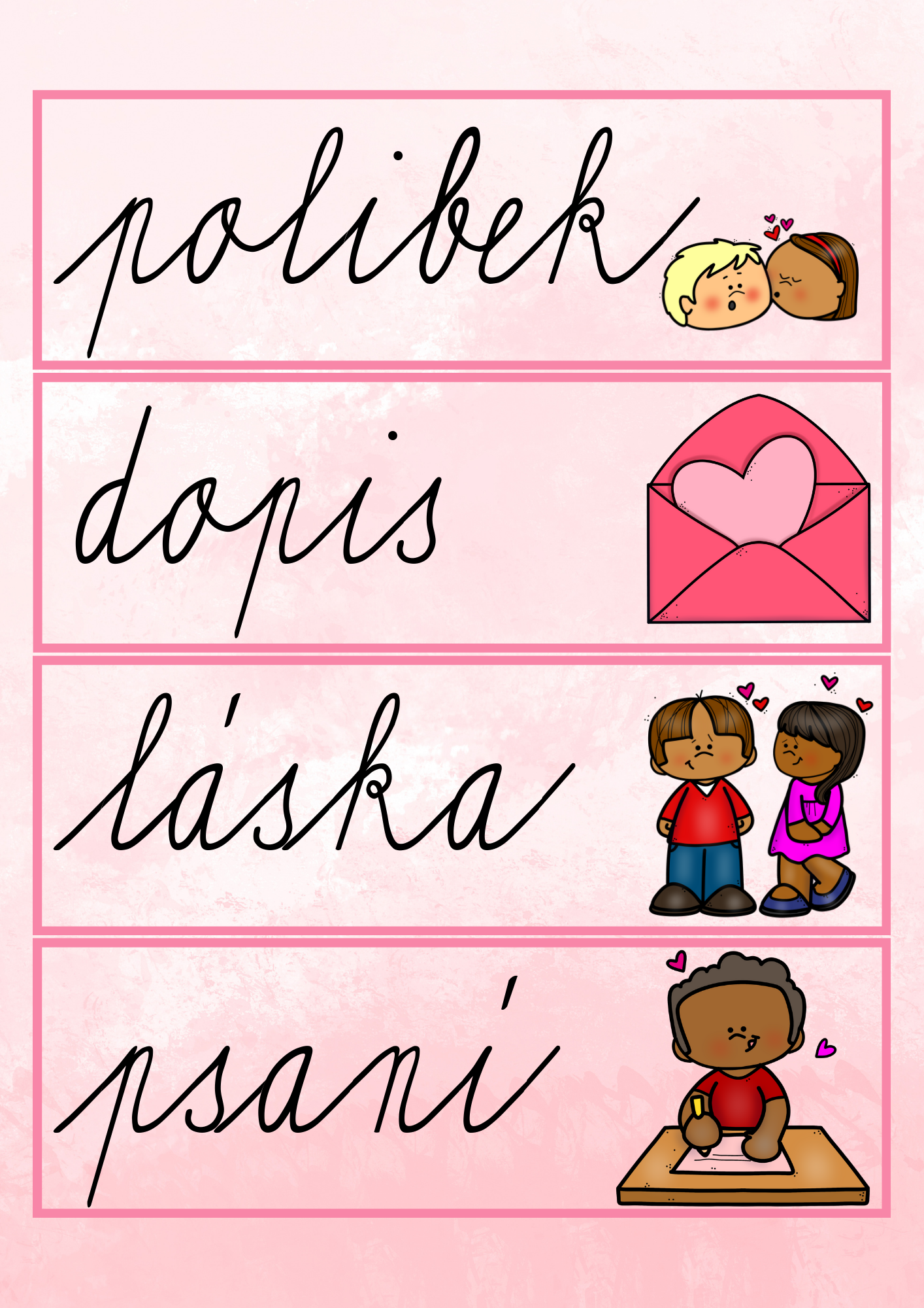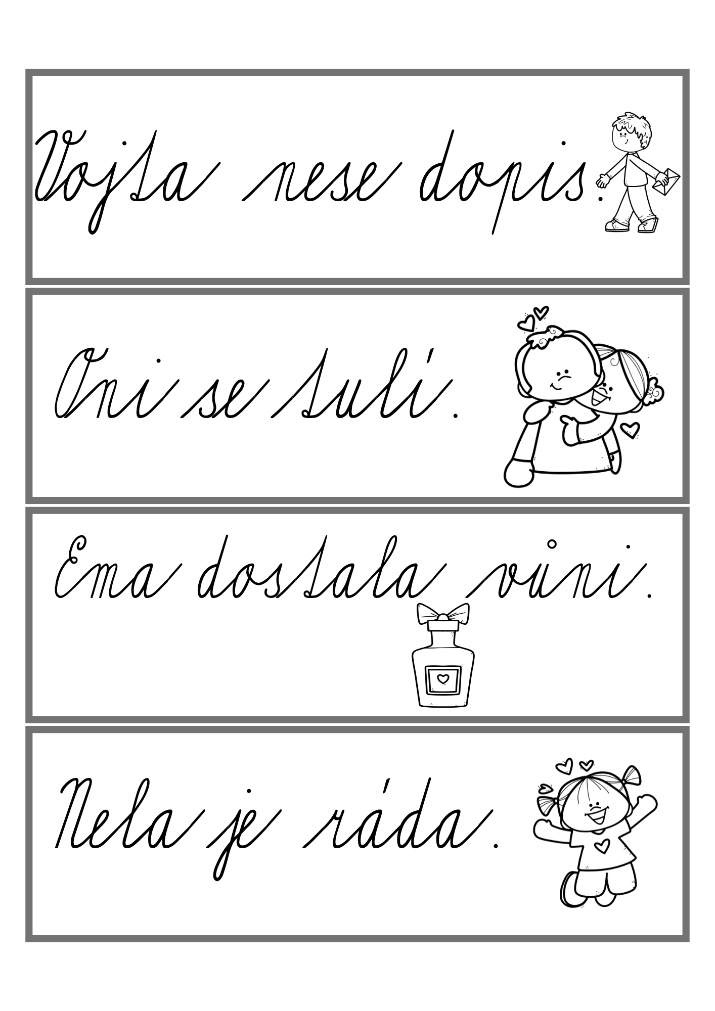 - Procvičování čtení a psaní slov a jednoduchých vět. Děti pracují se slovy obsahujícími všechny samohlásky a se souhláskami L, M, P, S, J, V, N, T, K, D, Š, R. Aktivita podporuje čtení s porozuměním, paměť, zrakové vnímání a schopnost přepisu textu.