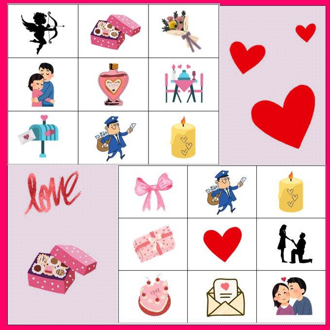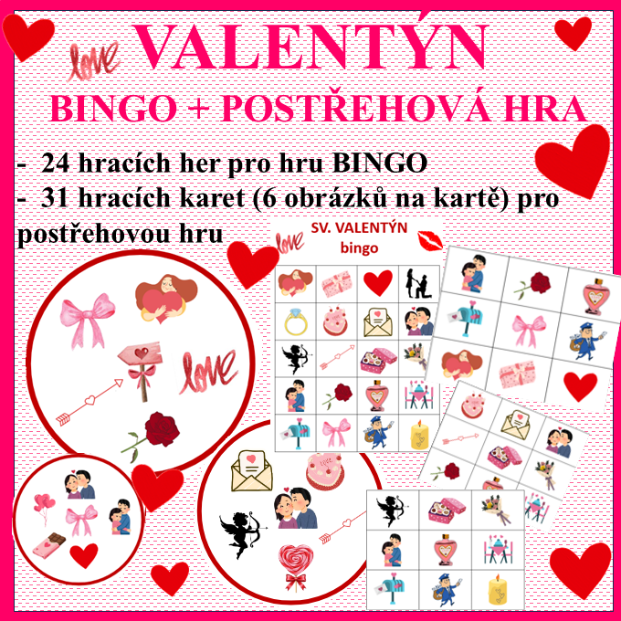 Díky hře Bingo si žáci procvičí postřeh, uvědomí si díky obrázkům co vše se pojí ke svátku zamilovaných a užijí si zábavu. 13 stran A4 – celkem 24 hracích karet na téma svátek svatého Valentýna a přehled všech symbolů.
