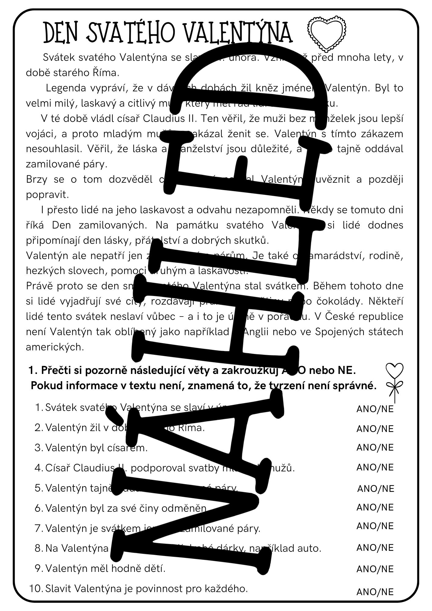 Čtení s porozuměním – Svátek svatého Valentýna (3. třída)