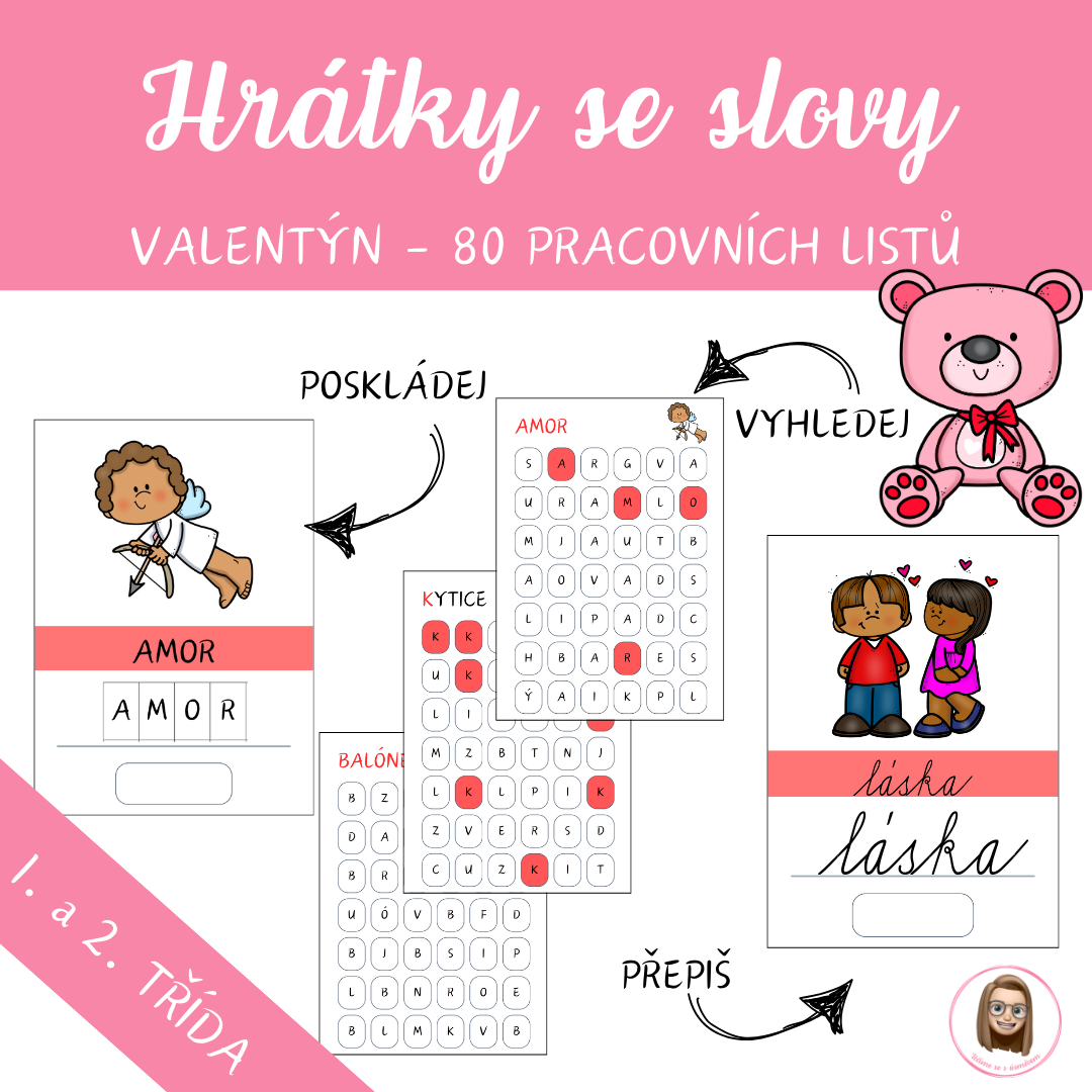 Soubor je zaměřen na rozvoj čtenářských a jazykových dovedností prostřednictvím hravých aktivit s valentýnskou tematikou. Obsahuje celkem 80 pracovních listů (4 různé typy úloh ke každému z 20 slov), které dětem umožňují procvičovat práci se slovy.