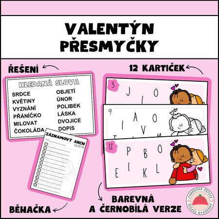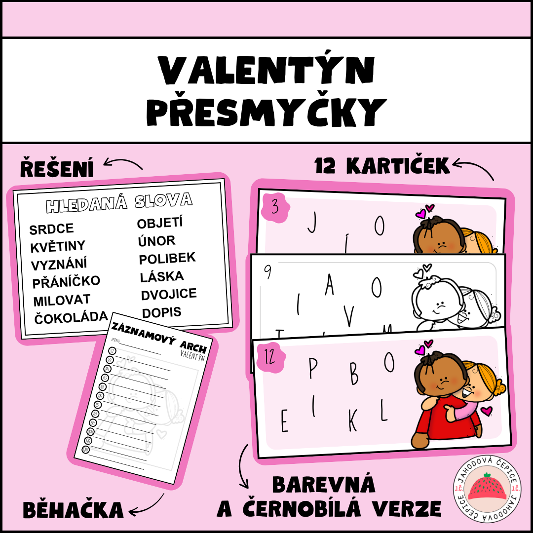 Tato zábavná hra je ideální pro žáky, kteří si chtějí otestovat své dovednosti při luštění přesmyček. Žáci si procvičí svou slovní zásobu a kreativitu při luštění přesmyček spojených s tematikou Valentýn.