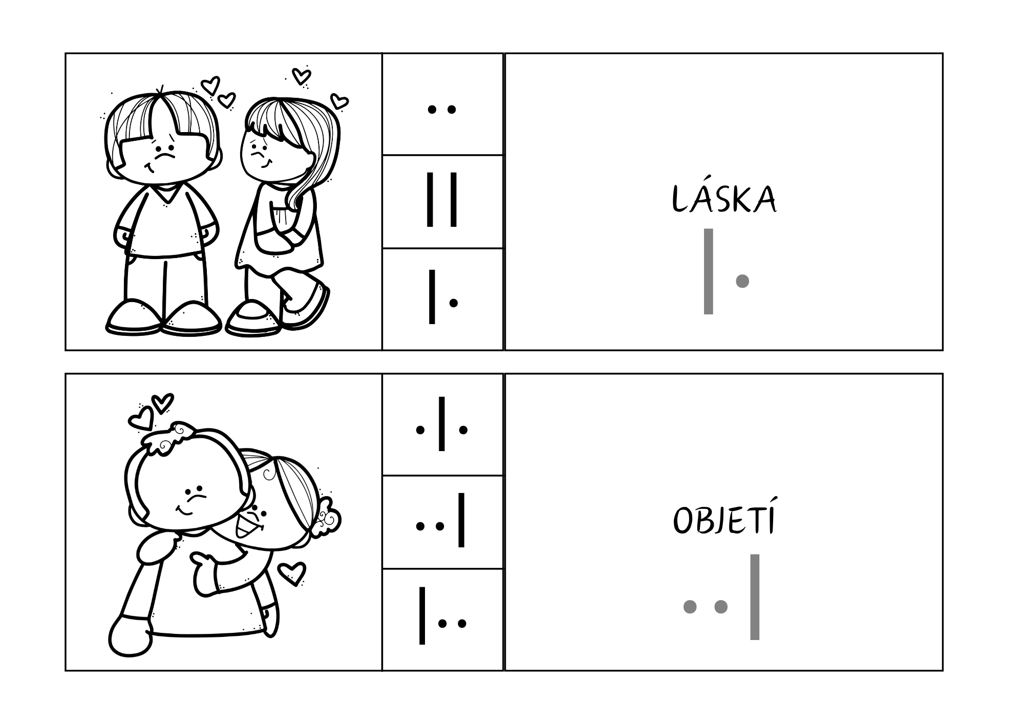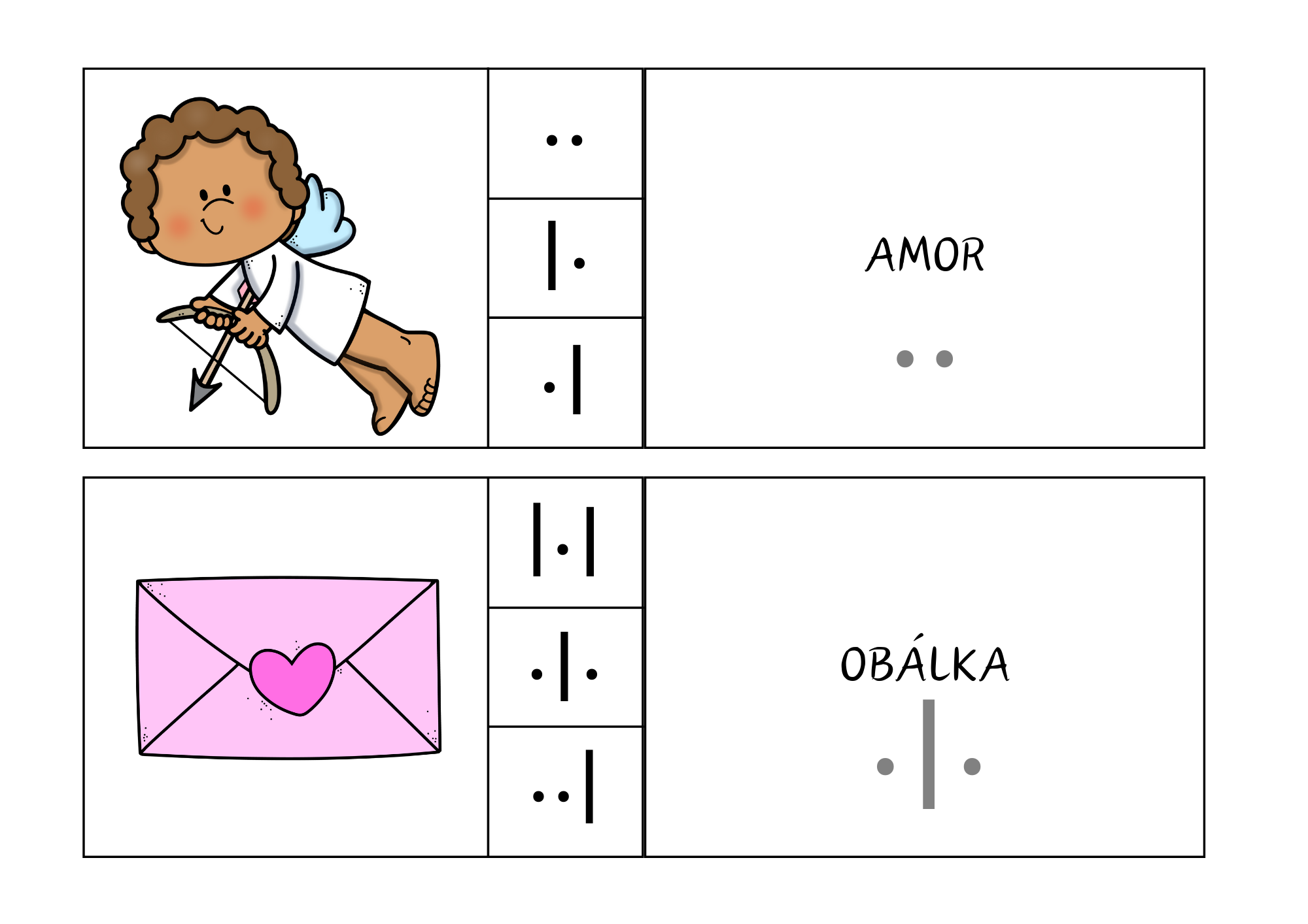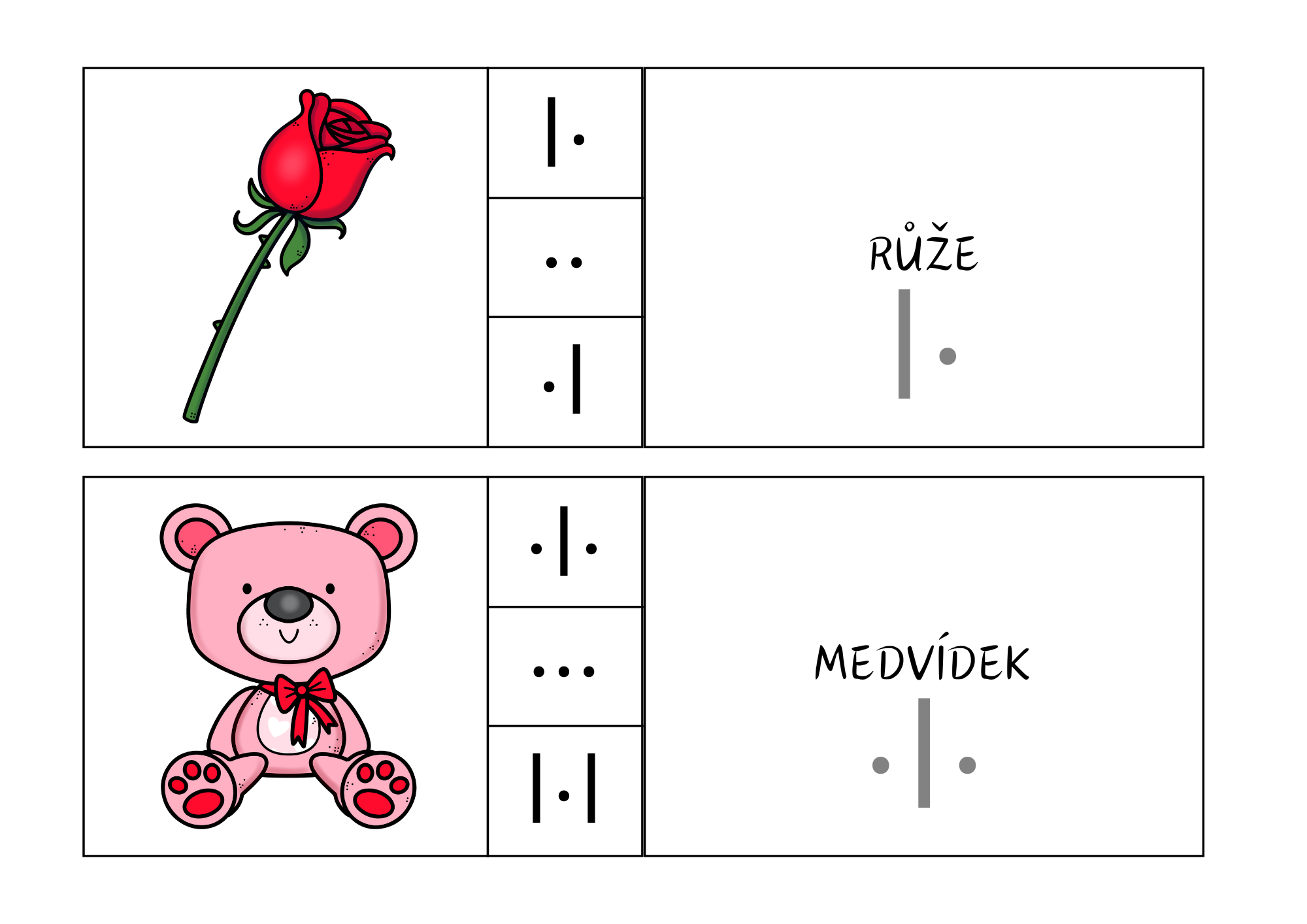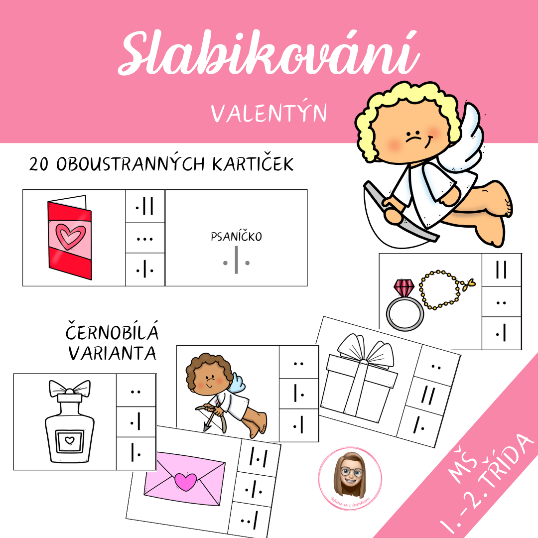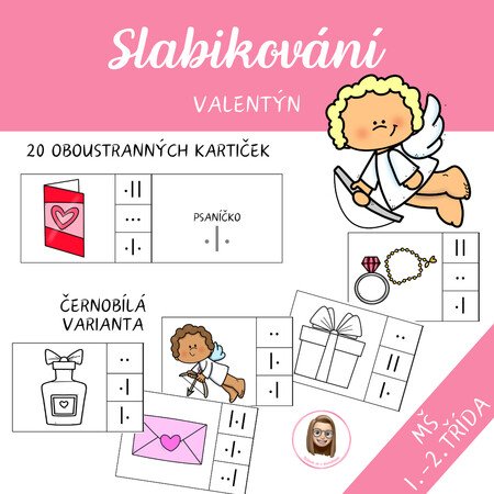 Soubor je zaměřen na rozvoj fonematického sluchu, analýzy a syntézy slabik prostřednictvím slabikování slov s valentýnskou tematikou. Děti pracují s obrázkovými kartičkami, pojmenovávají slova, rozkládají je na slabiky a zaznamenávají jejich délku pomocí symbolů.