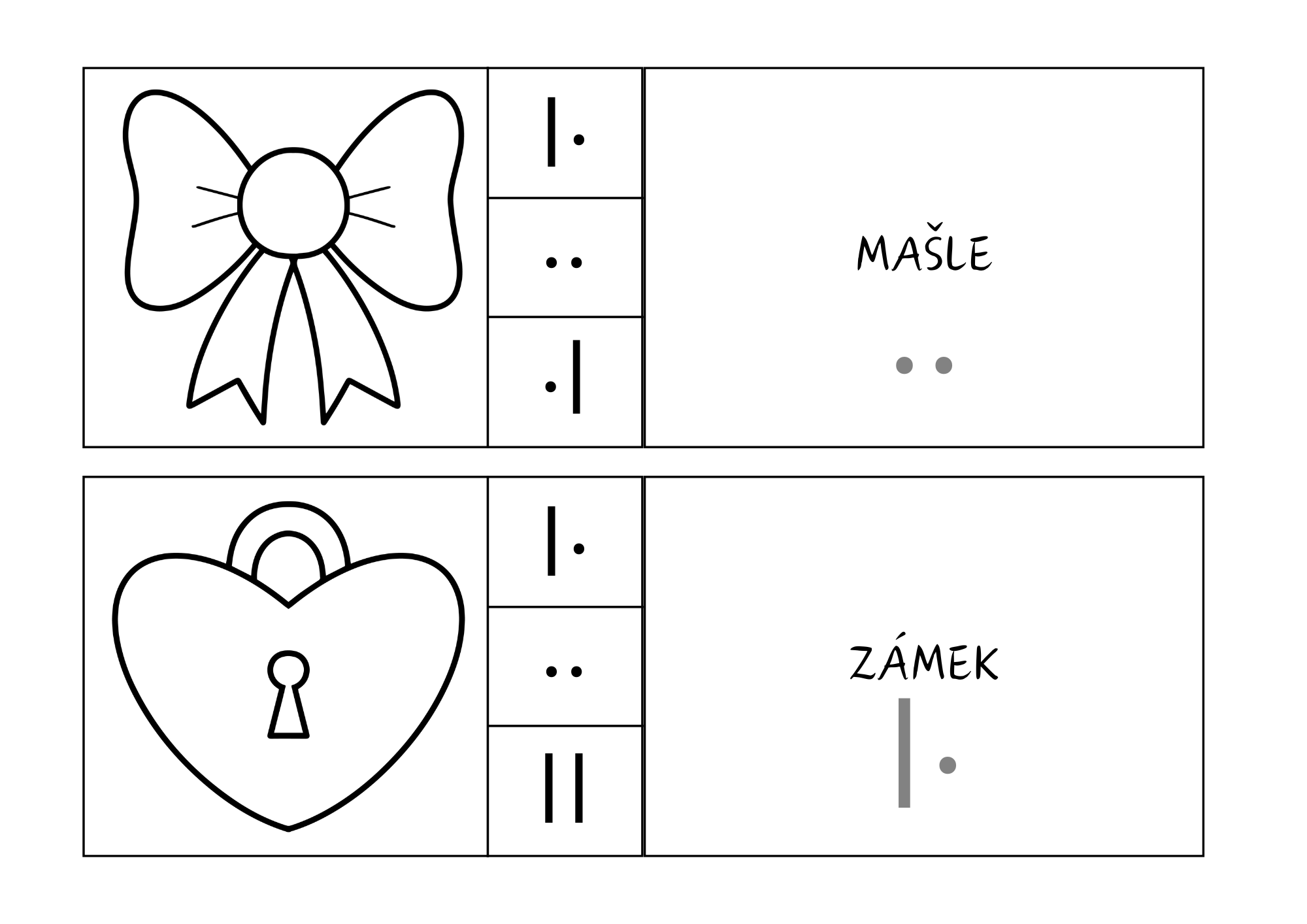 Soubor obsahuje 20 obrázkových kartiček se slovy k procvičování slabikování a 20 kontrolních kartiček pro samokontrolu. Děti rozlišují krátké a dlouhé slabiky a rozvíjejí fonematický sluch.