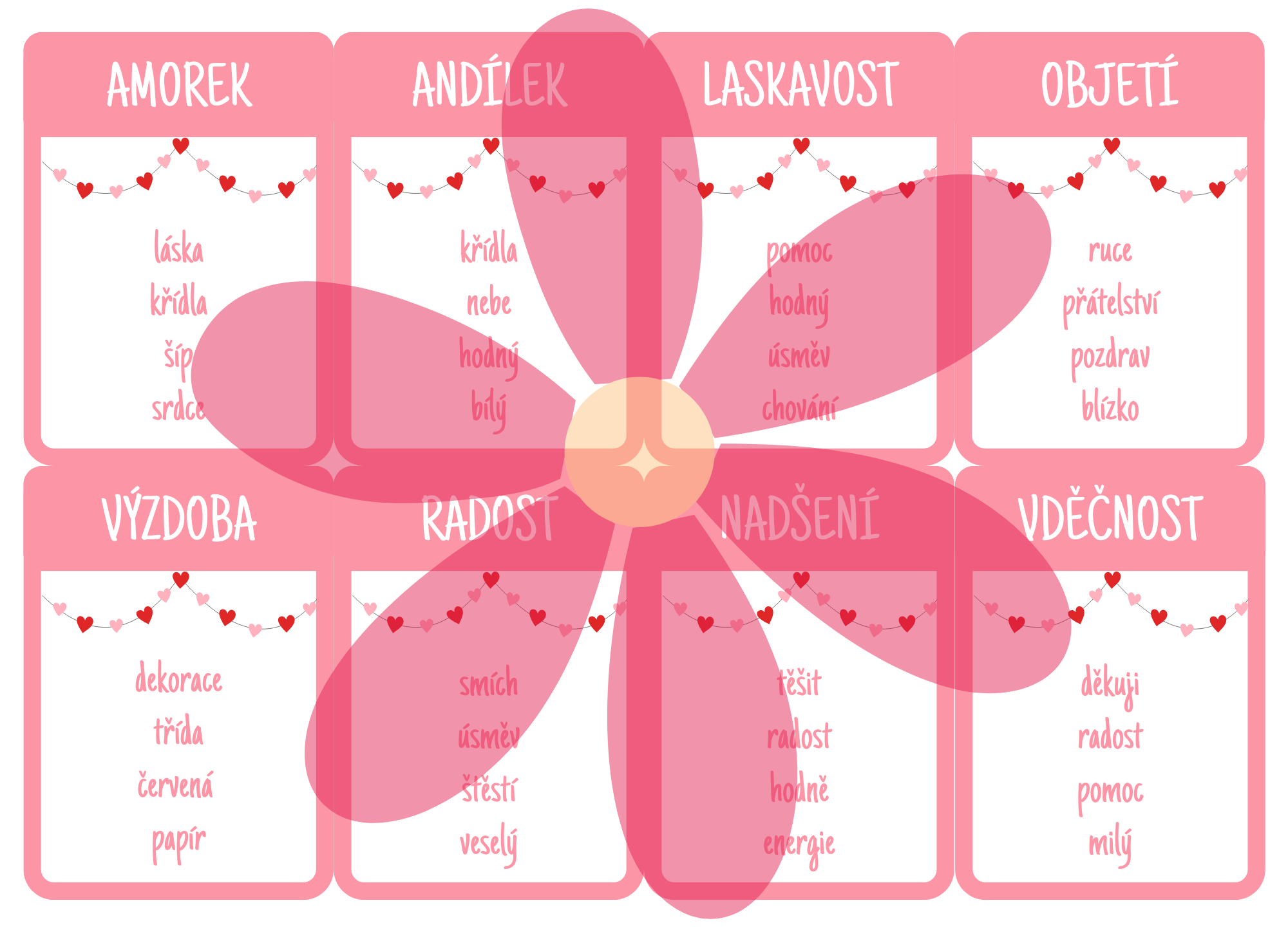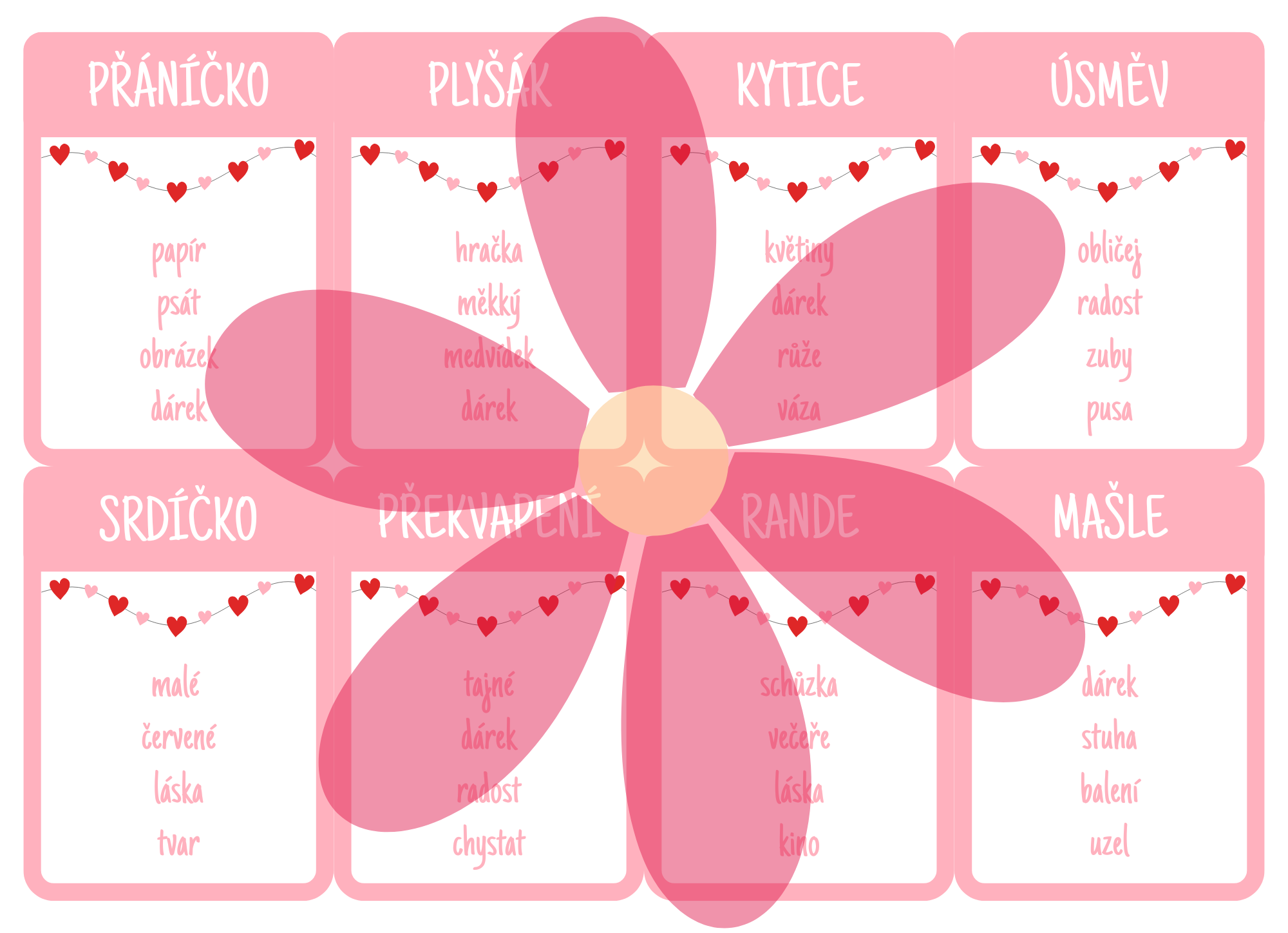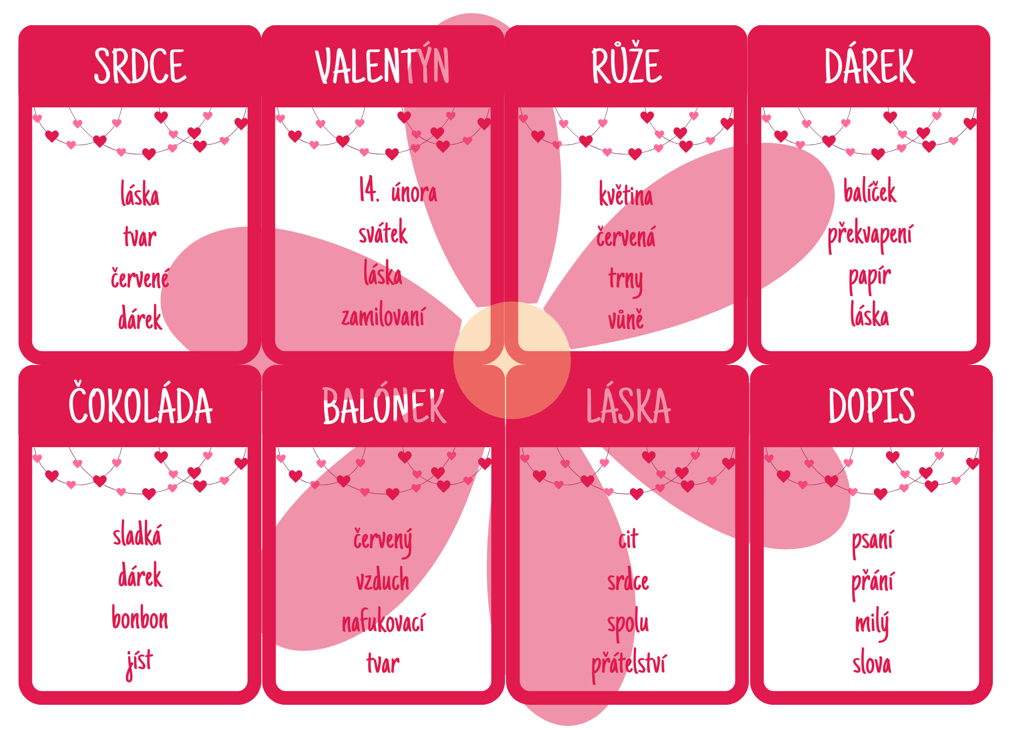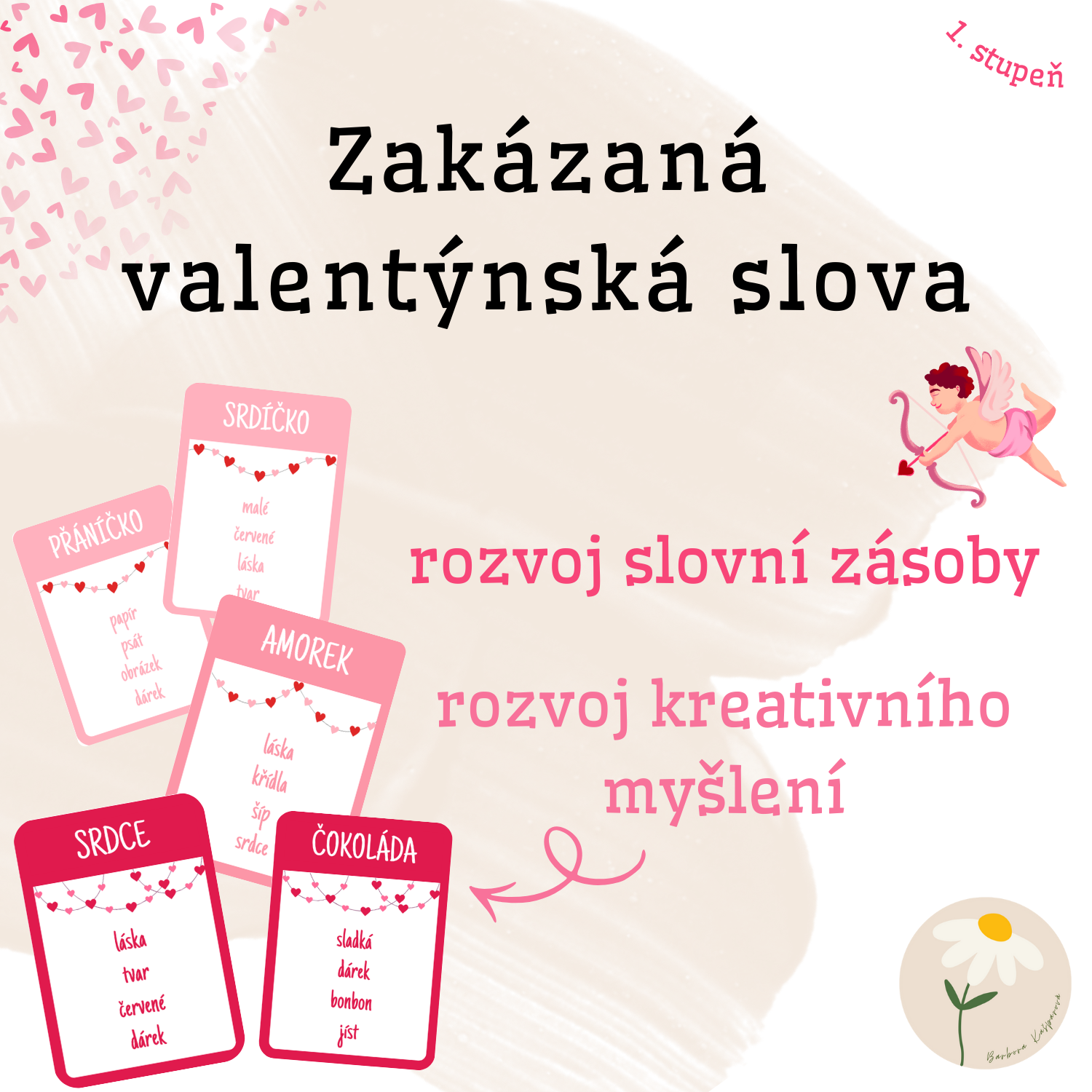 Tento materiál je určen pro žáky 1. stupně základní školy. Prostřednictvím zábavné slovní hry se děti učí popisovat pojmy, vyjadřovat myšlenky a rozšiřovat slovní zásobu, aniž by použily vybraná „zakázaná slova“. Témata jsou laděna do valentýnské a přátelské atmosféry a zahrnují pojmy z oblasti vztahů, emocí, drobných dárků a projevů laskavosti.