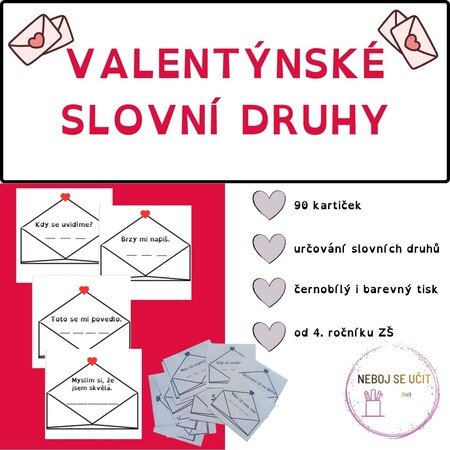 Materiál Valentýnské slovní druhy obsahuje 90 karet s krátkými větami. Tyto věty jsou zpracovány s ohledem na valentýnskou tematiku, objevují se témata lásky, sebelásky či přátelství. Úkolem žáka je určit slovní druhy u jednotlivých slov. Karty je možné barevně i černobíle vytisknout, ze zadní strany mají uvedené řešení. Jsou vhodné pro žáky od 4. ročníku ZŠ.