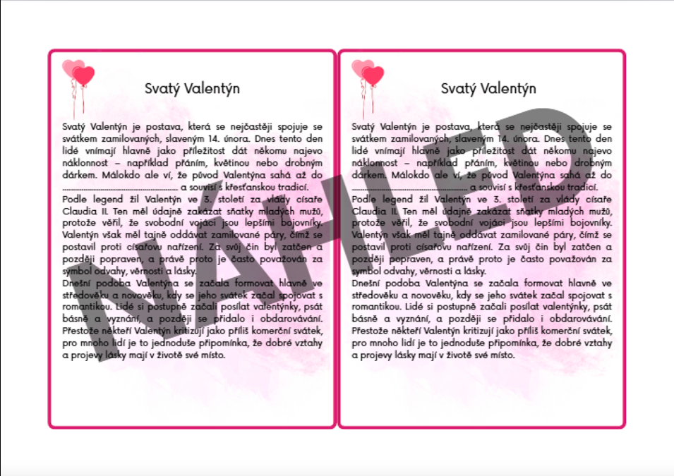 - Kartičku s textem o svatém Valentýnovi
