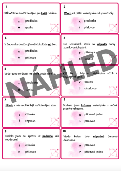Žáci mají za úkol si přečíst text o svatém Valentýnovi. V textu se ale nachází jednovynechané místo a pomocí kartiček, kde žáci určují slovní druhy u podtržených slov, odhalí, co na něj patří.