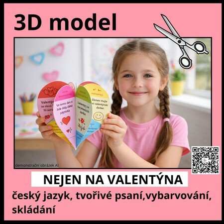 Pokud se rozhodnete pro tvořivou nadstavbu, lze z jednotlivých částí srdce sestavit jednoduchý prostorový 3D model. Děti jednotlivé díly přeloží a slepí rubovými stranami k sobě. Vznikne plastický objekt, který se rozevírá do prostoru a je možné jej vystavit ve třídě, zavěsit do okna nebo využít jako dekoraci.