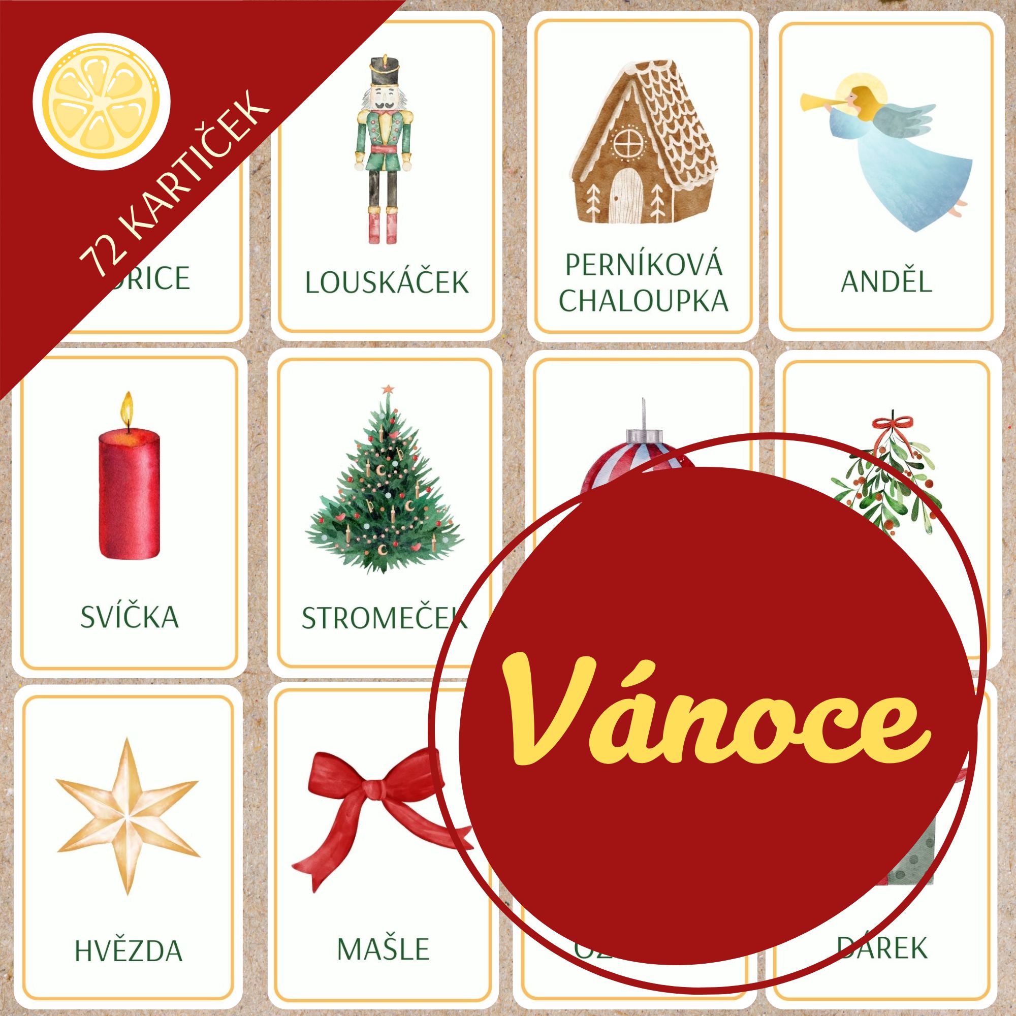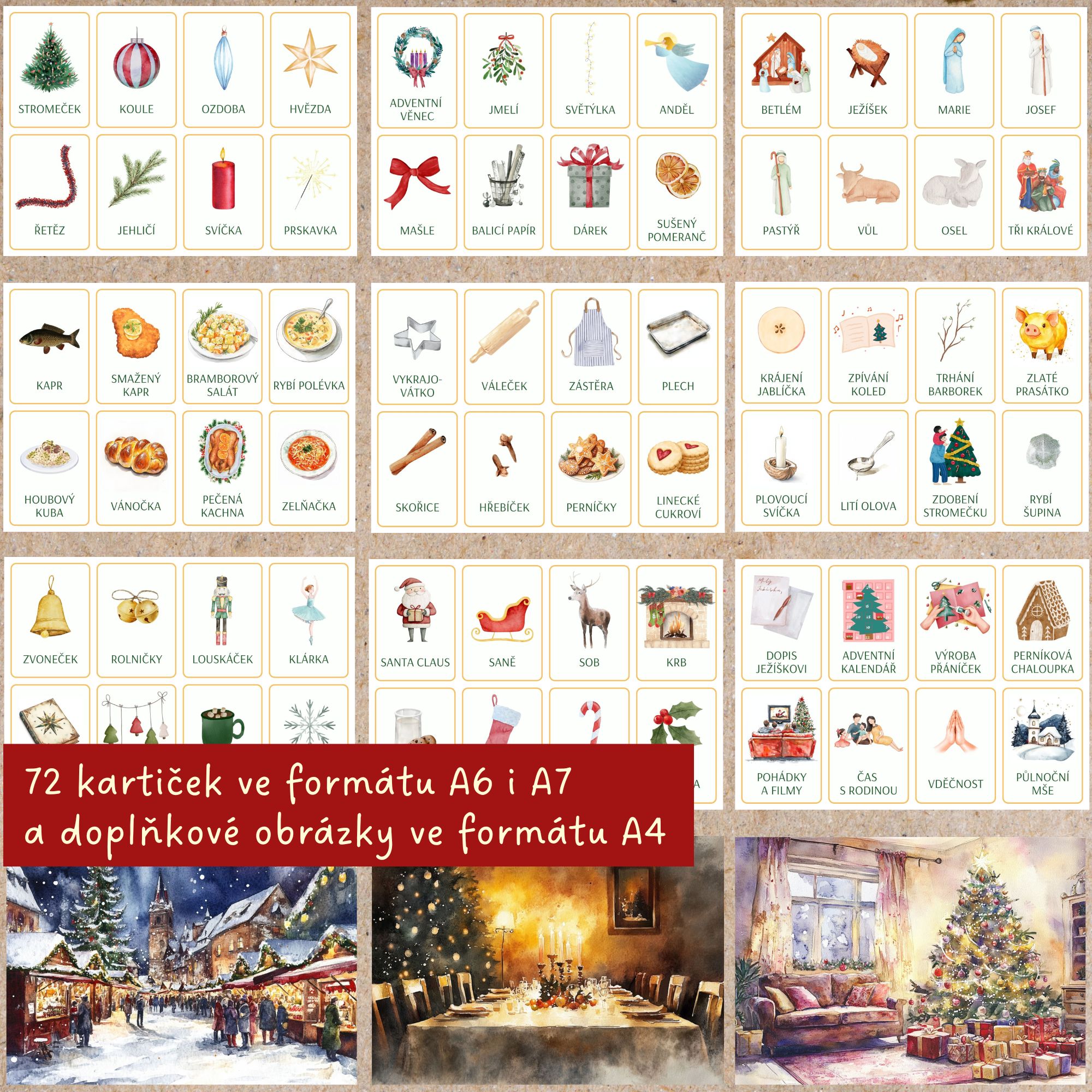 ⭐Součástí sady je 72 kartiček ve formátech A6 a A7 a 4 doplňkové obrázky ve formátu A4. Zobrazená témata: Vánoce, vánoční tradice, aktivity, dekorace, jídlo, pečení, americké Vánoce... Víte, že tato sada je součástí VÝHODNÉHO BALÍČKU, ve kterém najdete kompletní sbírku našich obrázkových demonstračních kartiček?