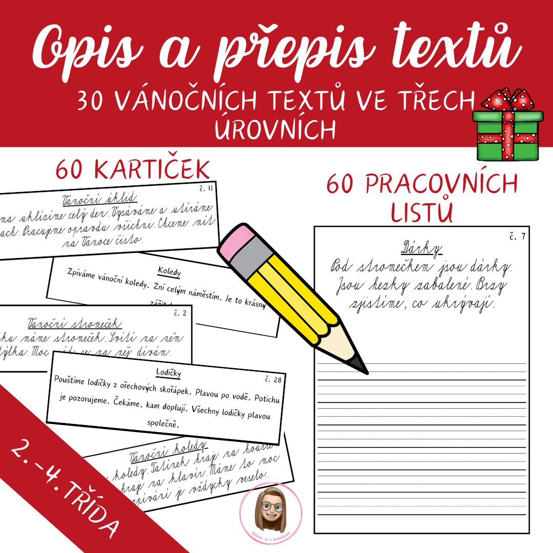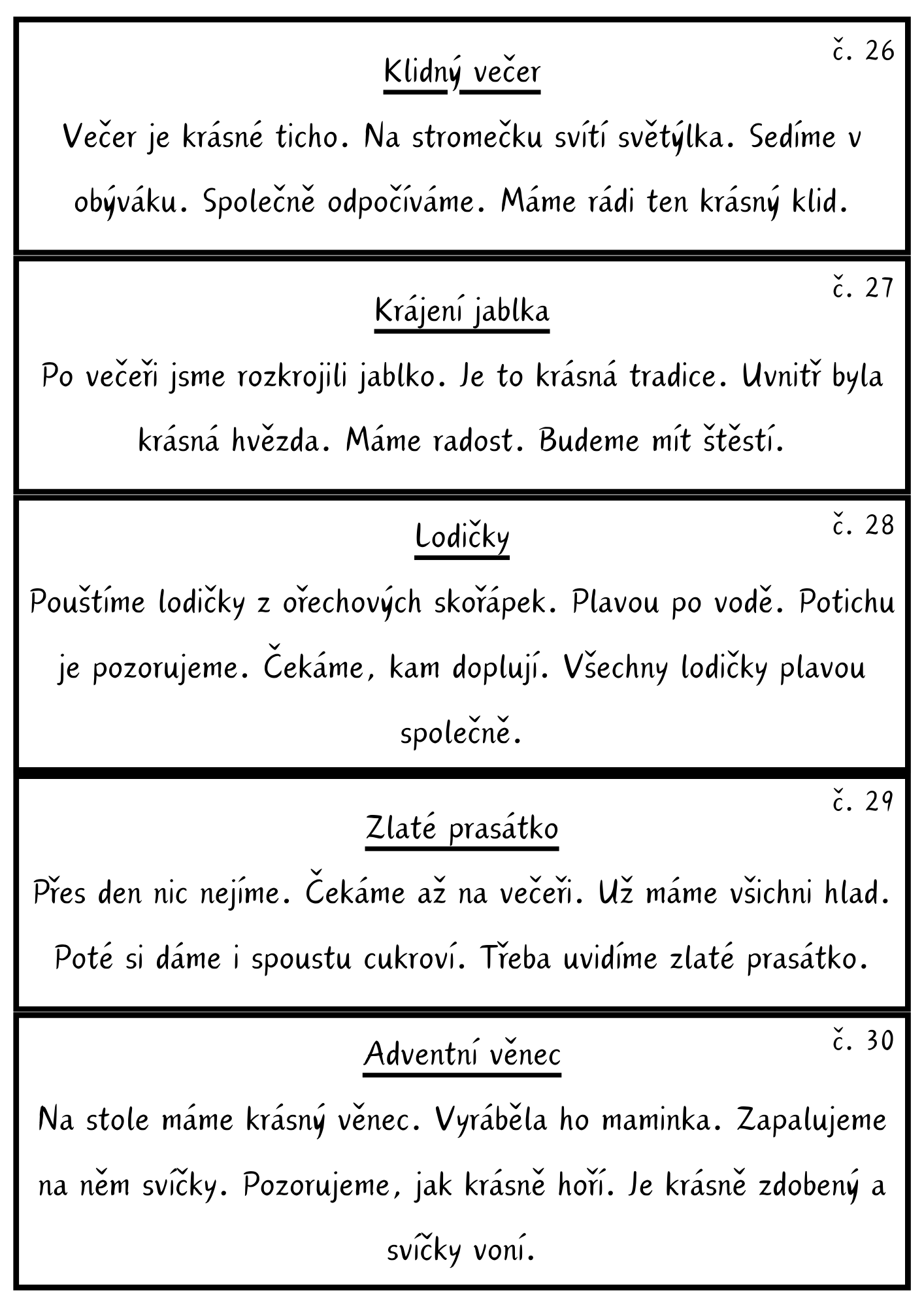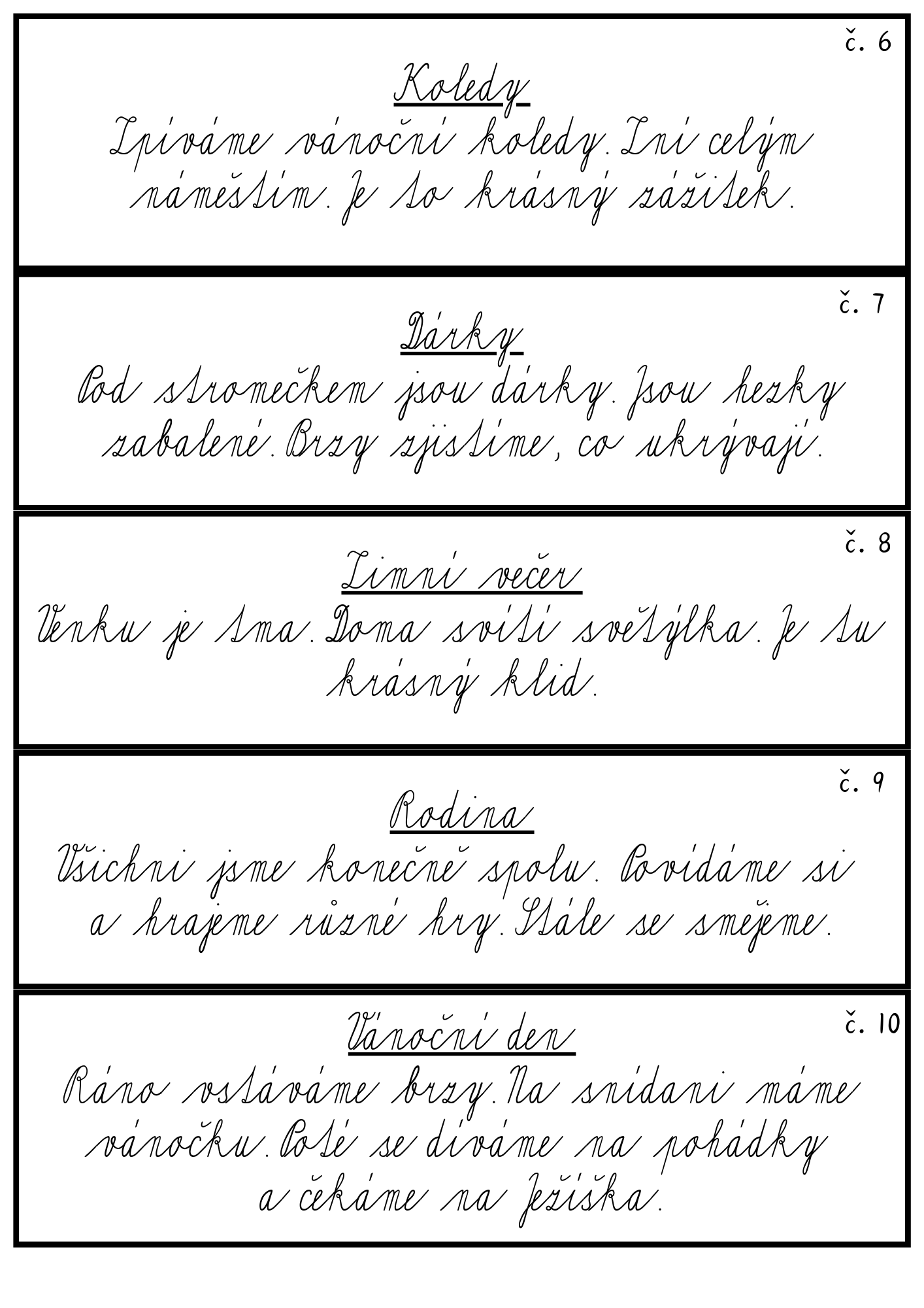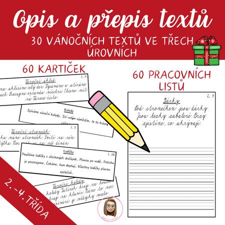 Vánočně laděný soubor krátkých textů určený k opisu a přepisu, který systematicky rozvíjí čtení, psaní a porozumění textu. Texty jsou tematicky zaměřené na české Vánoce, tradice a zimní atmosféru a jsou rozděleny podle počtu vět do tří obtížností.