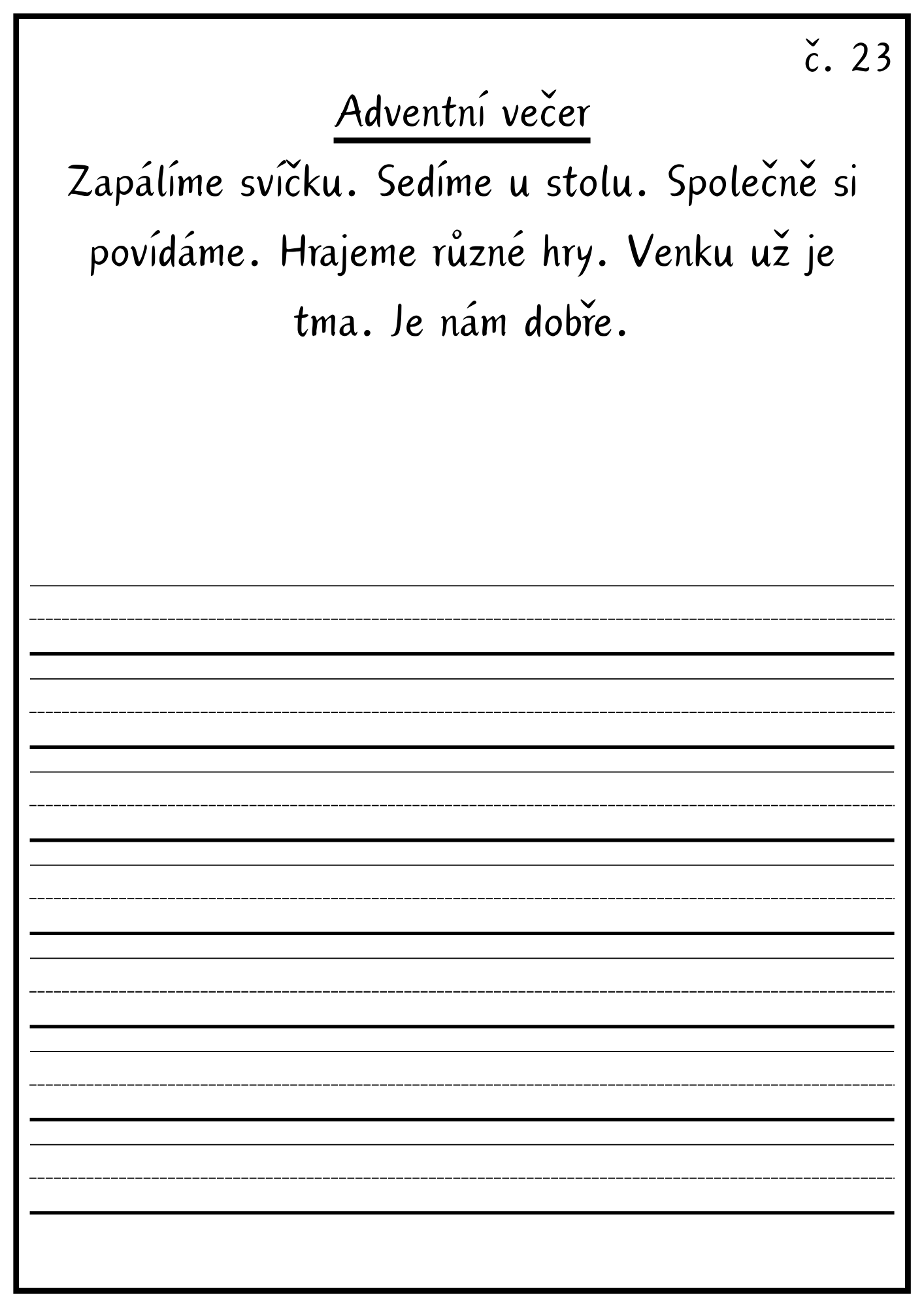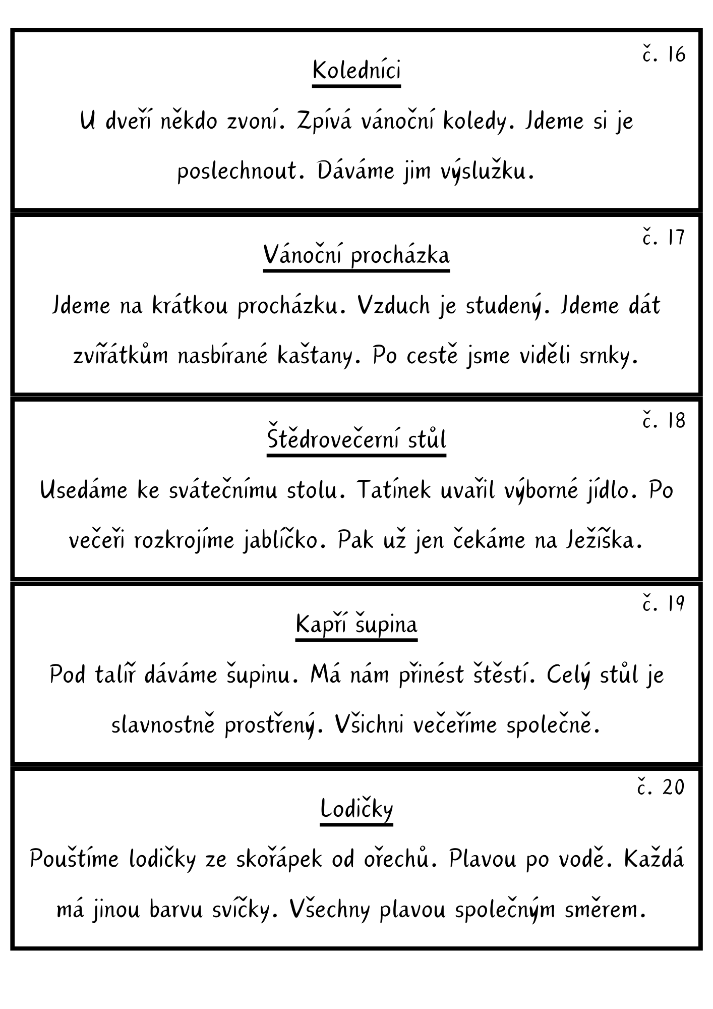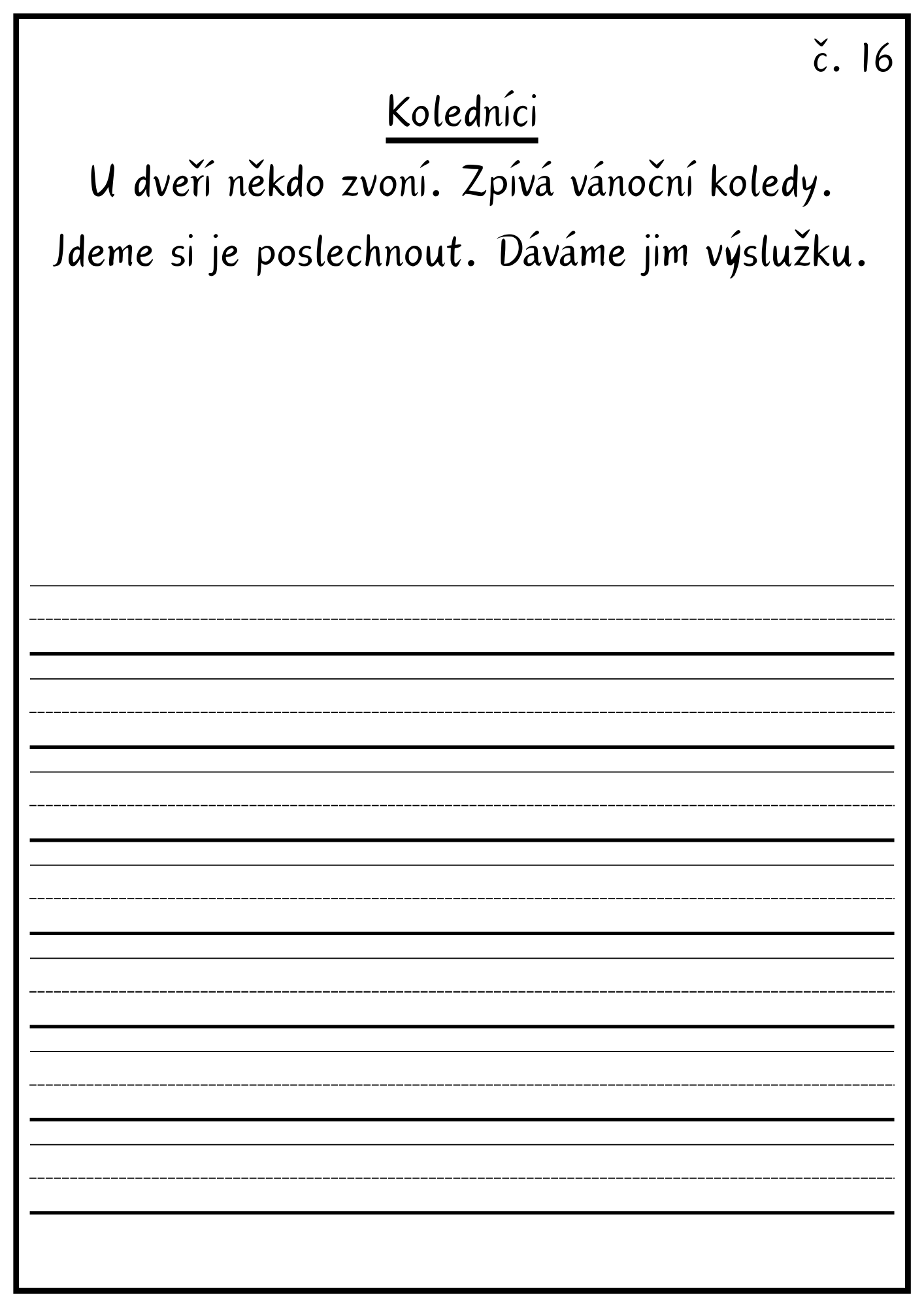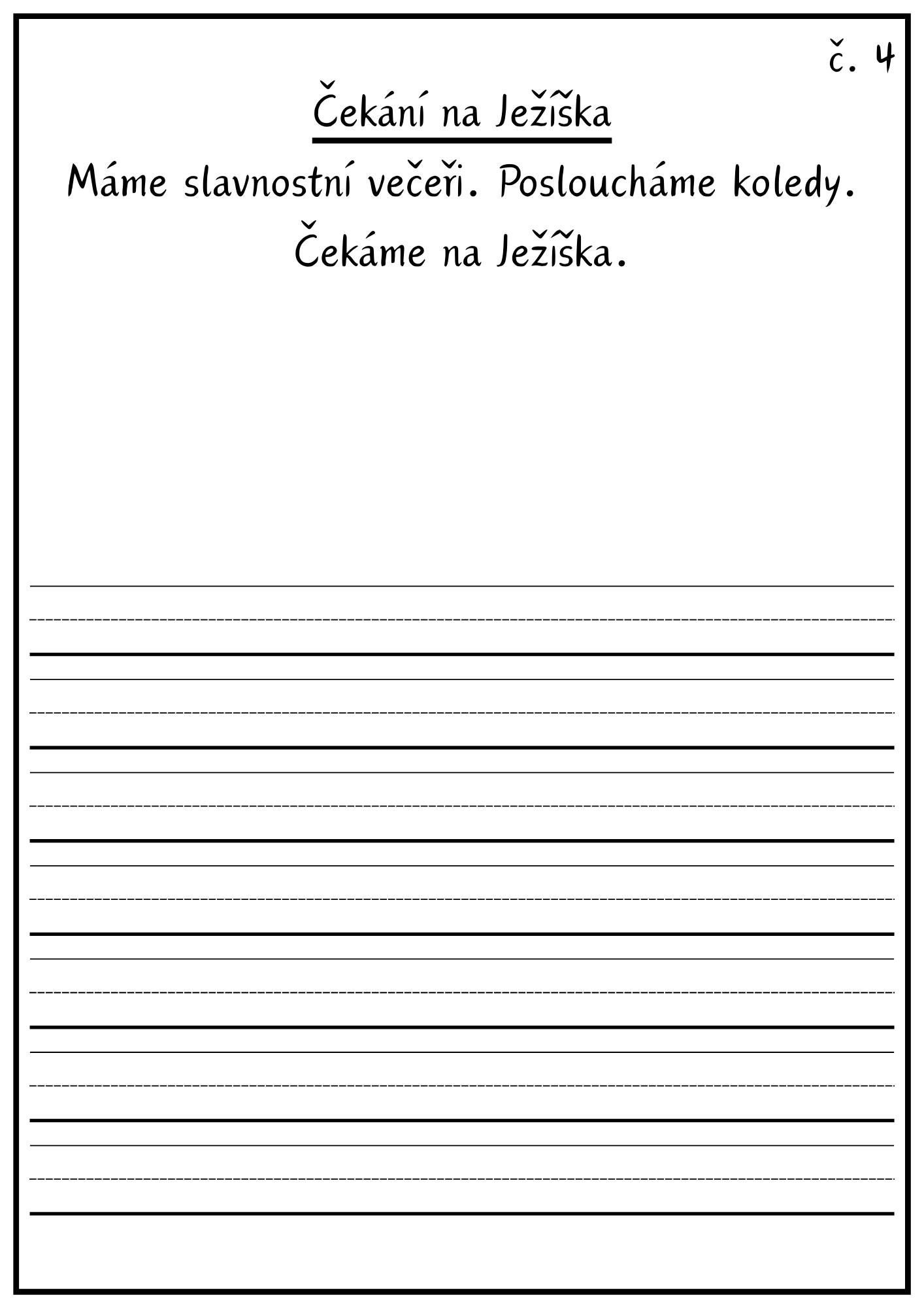Vánočně laděný soubor krátkých textů určený k opisu a přepisu, který systematicky rozvíjí čtení, psaní a porozumění textu. Texty jsou tematicky zaměřené na české Vánoce, tradice a zimní atmosféru a jsou rozděleny podle počtu vět do tří obtížností.
