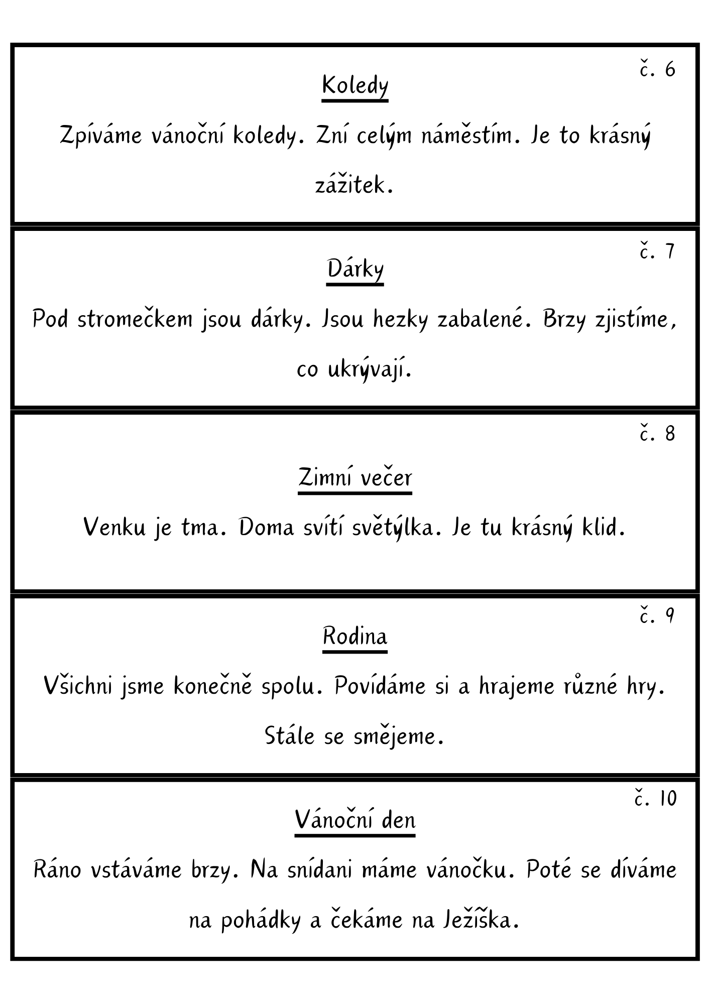 Vánoční soubor s 30 krátkými texty ve 3 obtížnostech (3, 4 a 5 vět).