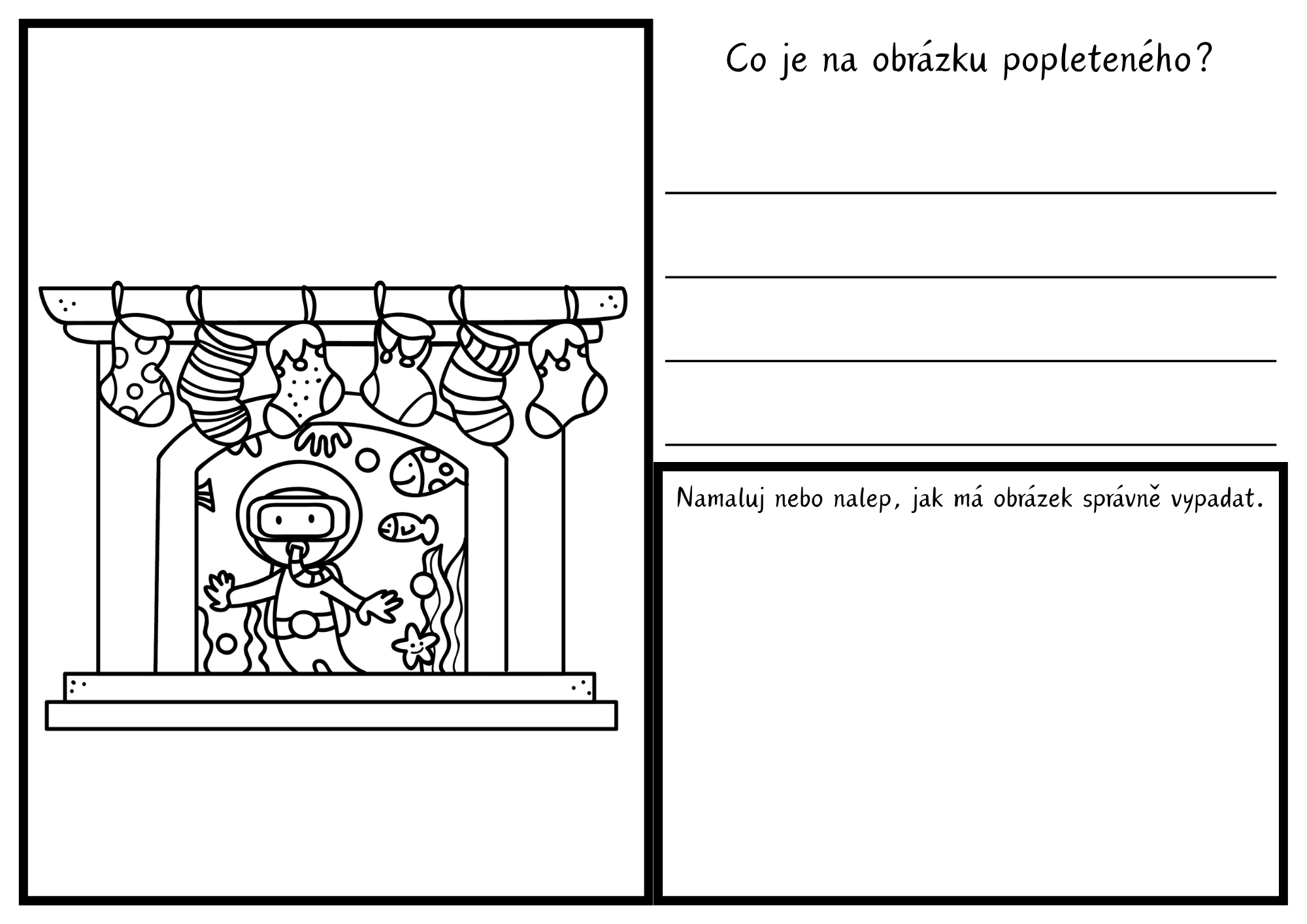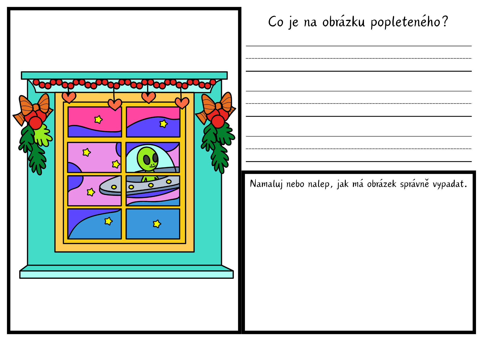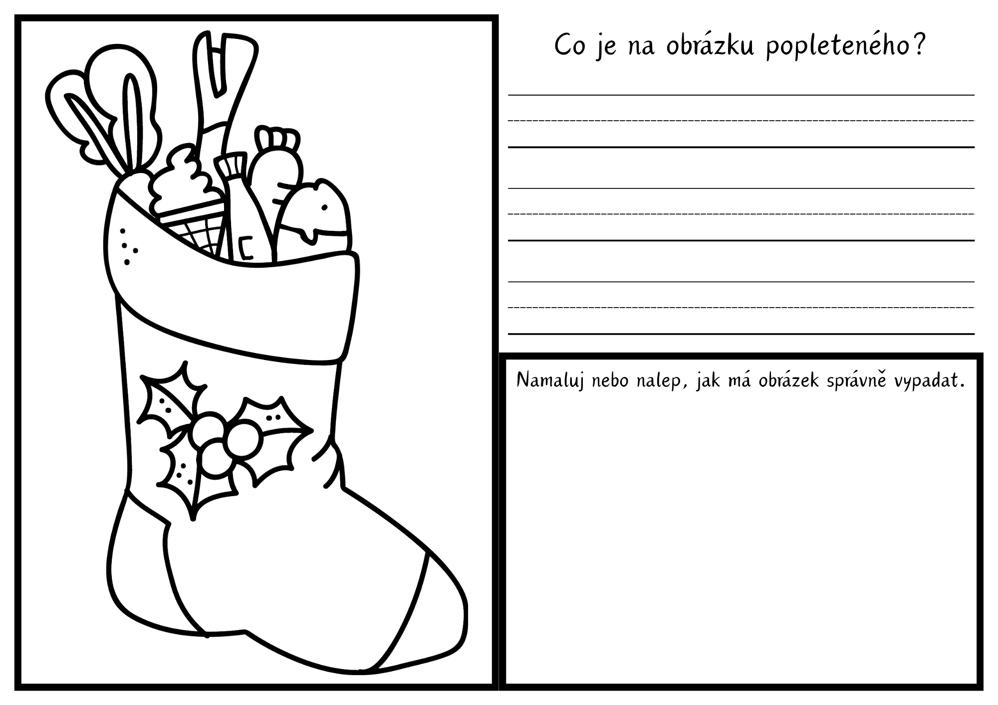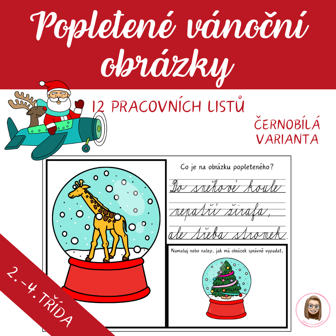Popletené vánoční obrázky jsou zábavný materiál určený pro žáky 2.–4. ročníku, kteří už zvládnou samostatně přemýšlet, popsat situaci a zapisovat své myšlenky. Na každém pracovním listu najdou děti obrázek, ve kterém je něco „špatně“. Jejich úkolem je přijít na to, co je na obrázku popleteného, zapsat svůj postřeh na linky a nakreslit nebo nalepit správnou podobu obrázku. Skvělá aktivita do hodin českého jazyka, ranního kruhu, center aktivit i adventního období.