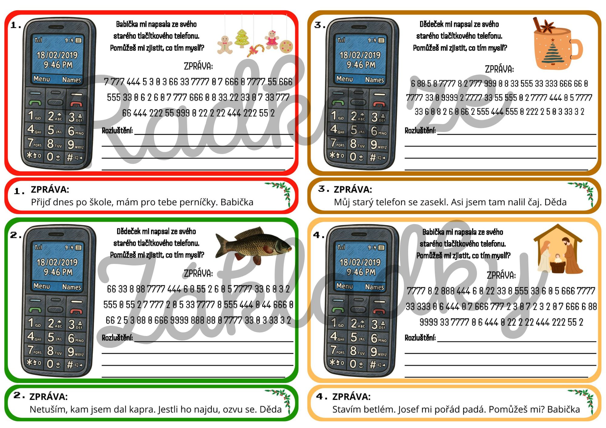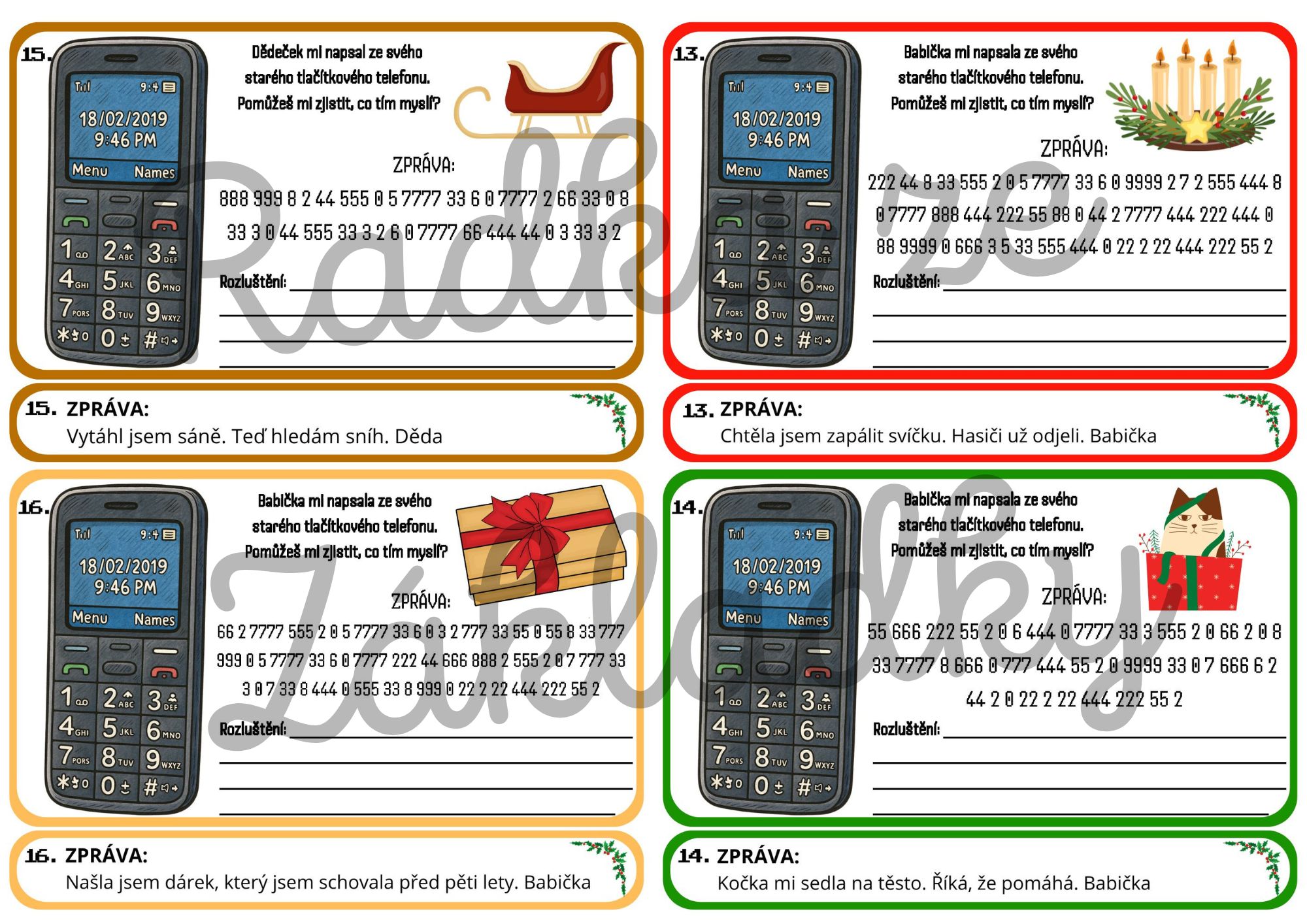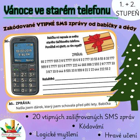 Vánoce ve starém telefonu je hravý a nápaditý materiál, který žákům nabízí možnost rozluštit zakódované vánoční vzkazy od babičky a dědy. Každá kartička pracuje s motivem starého tlačítkového telefonu, na kterém se písmena psala pomocí opakovaného mačkání čísel. Žáci tak převádějí číselné sekvence zpět do slov a odhalují, co jim chtěli prarodiče vlastně napsat.