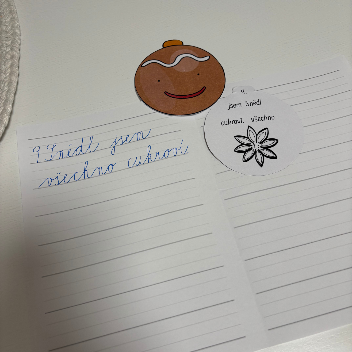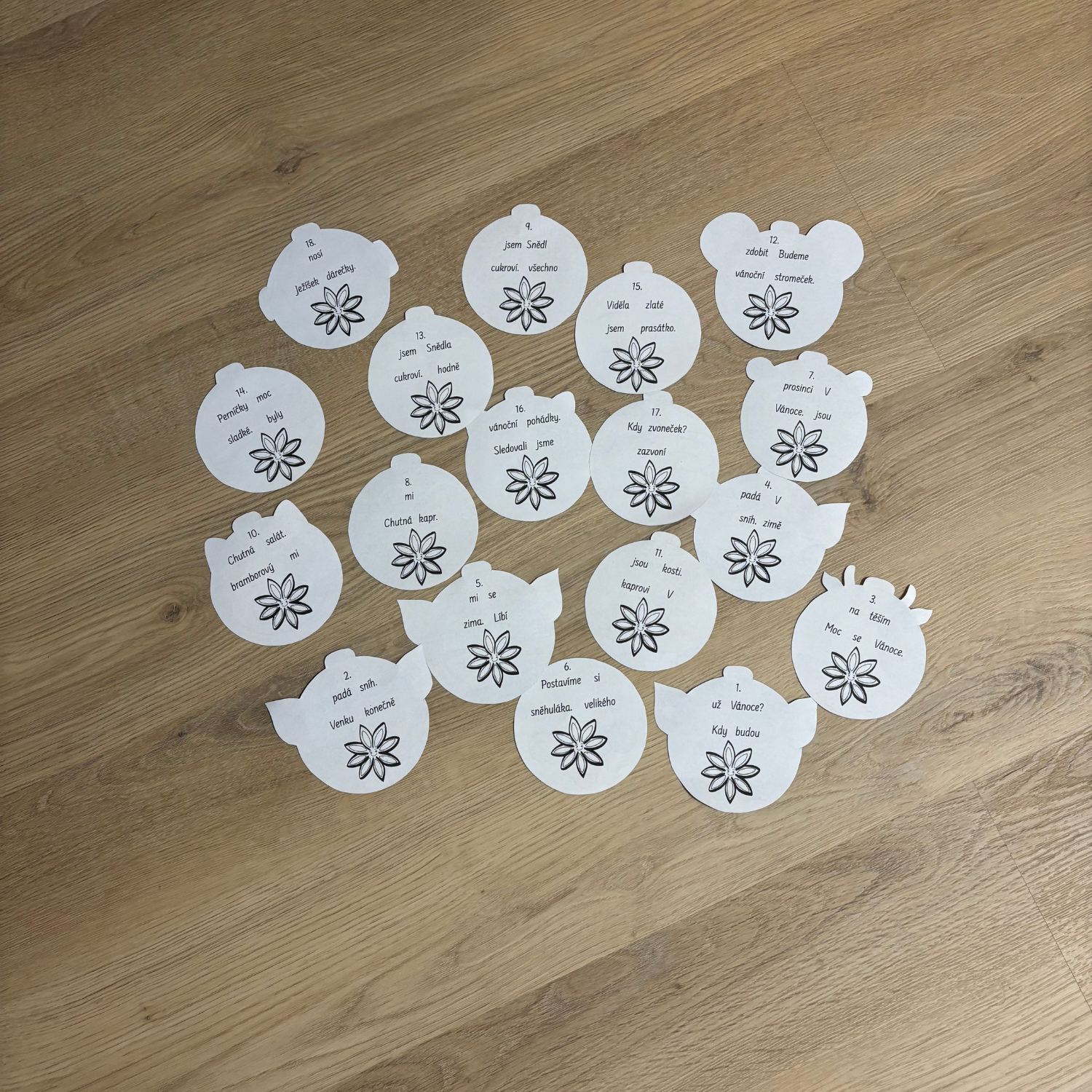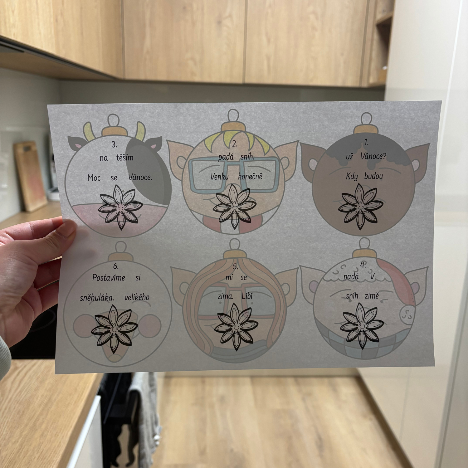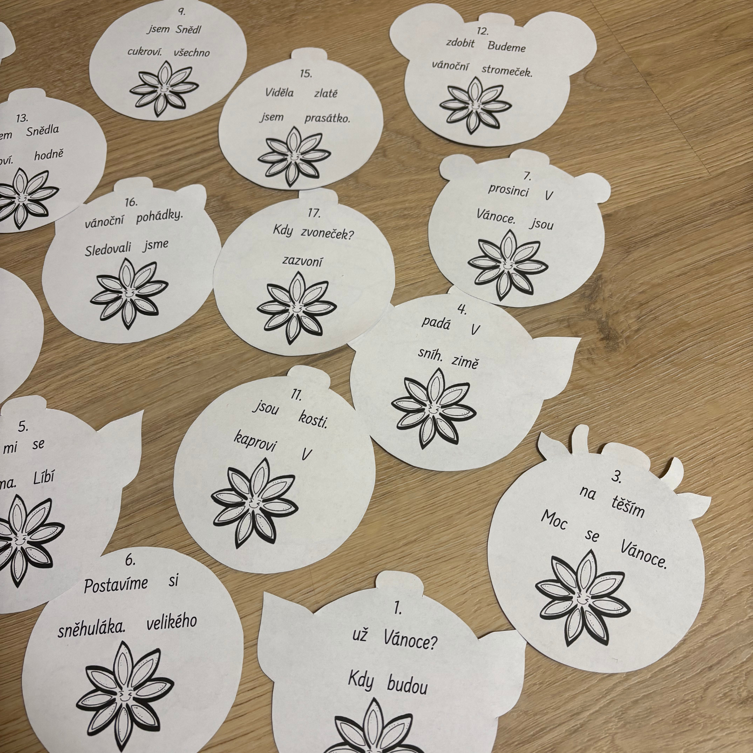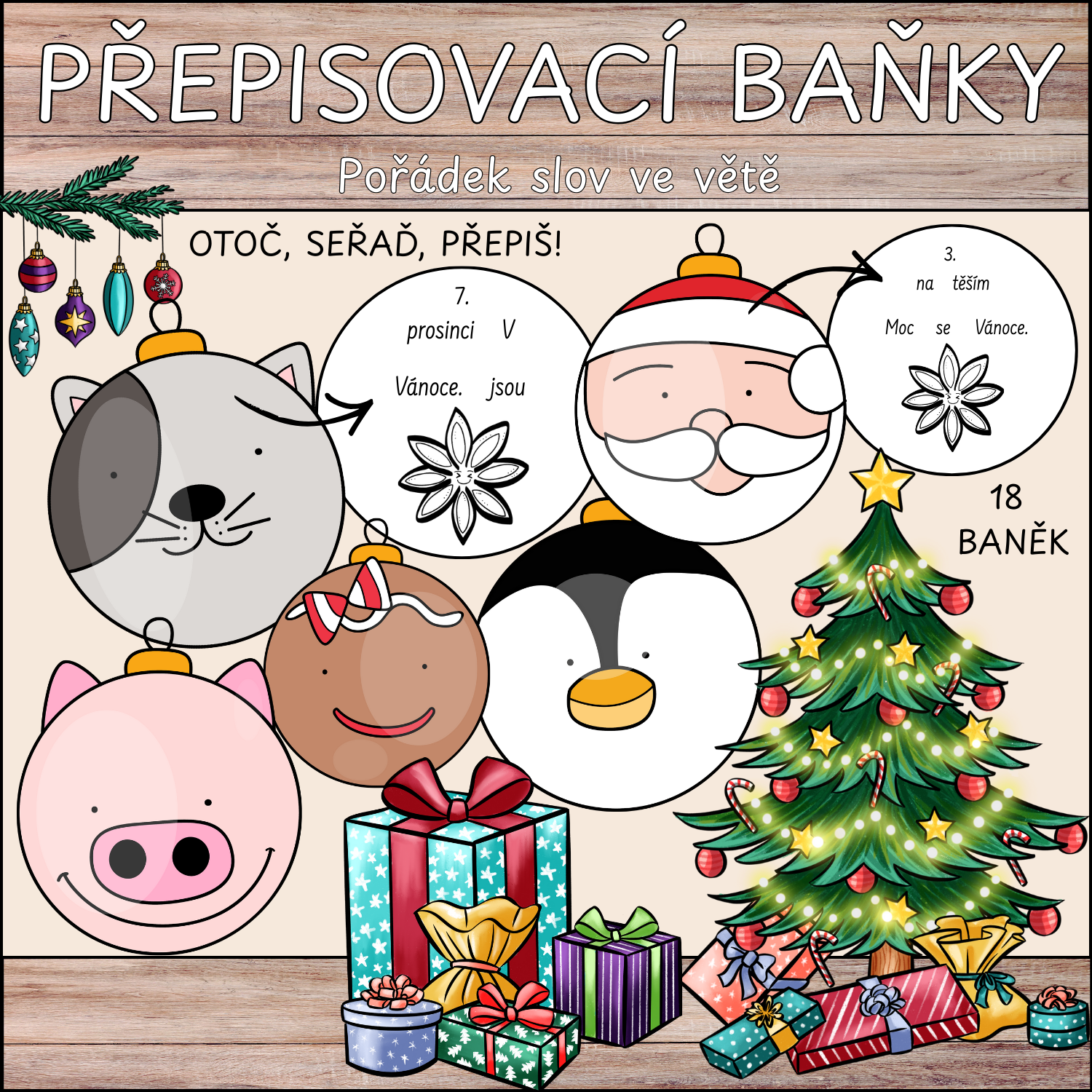 Materiál obsahuje 18 kartiček ve tvaru vánočních baněk, pomocí kterých si žáci procvičují správné řazení slov ve větě a následný správný přepis. Každá baňka nese sadu slov, která tvoří jednu větu, a také své vlastní číslo.