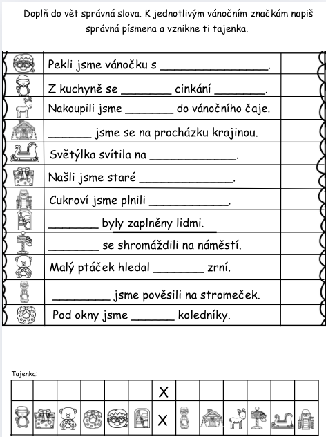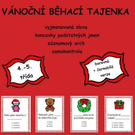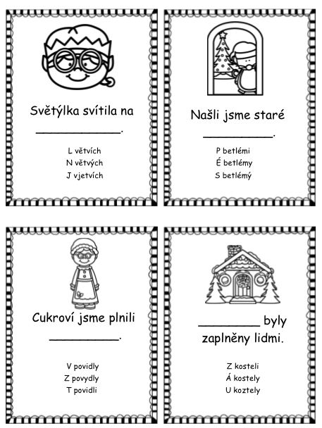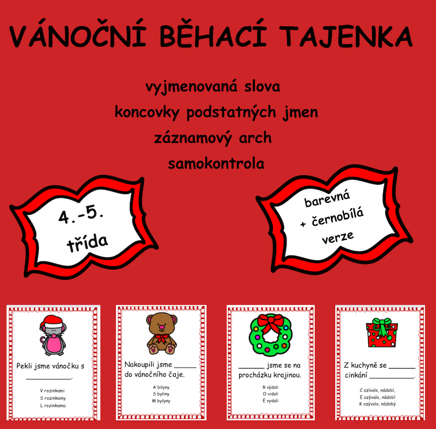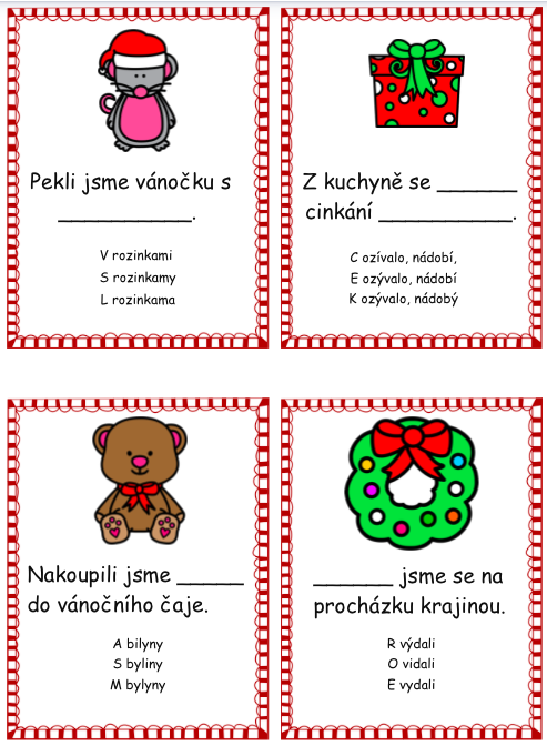 Materiál obsahuje 12 kartiček. Na každé kartičce se nachází věta s vánoční tematikou, ve které si žáci procvičí vyjmenovaná slova či koncovky podstatných jmen. Vše zaznamenávají do archu. Po správném doplnění jim vyjde tajenka.