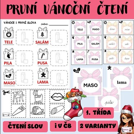 Žáci dostanou vybraný pracovní list. Žáci mají za úkol k danému symbolu v dárku najít slovo. Slovo si opíšou na řádek a dle významu slova nalepí správný obrázek. Nalepené obrázky lze i vybarvit. Pro rychlíky můžeme zařadit ještě gradovaný úkol = zapsat počet slabik a jejich grafické znázornění. Slova v materiálu najdete ve třech variantách - velká, tiskací písmena, malá, tiskací písmena a i psací tvar.