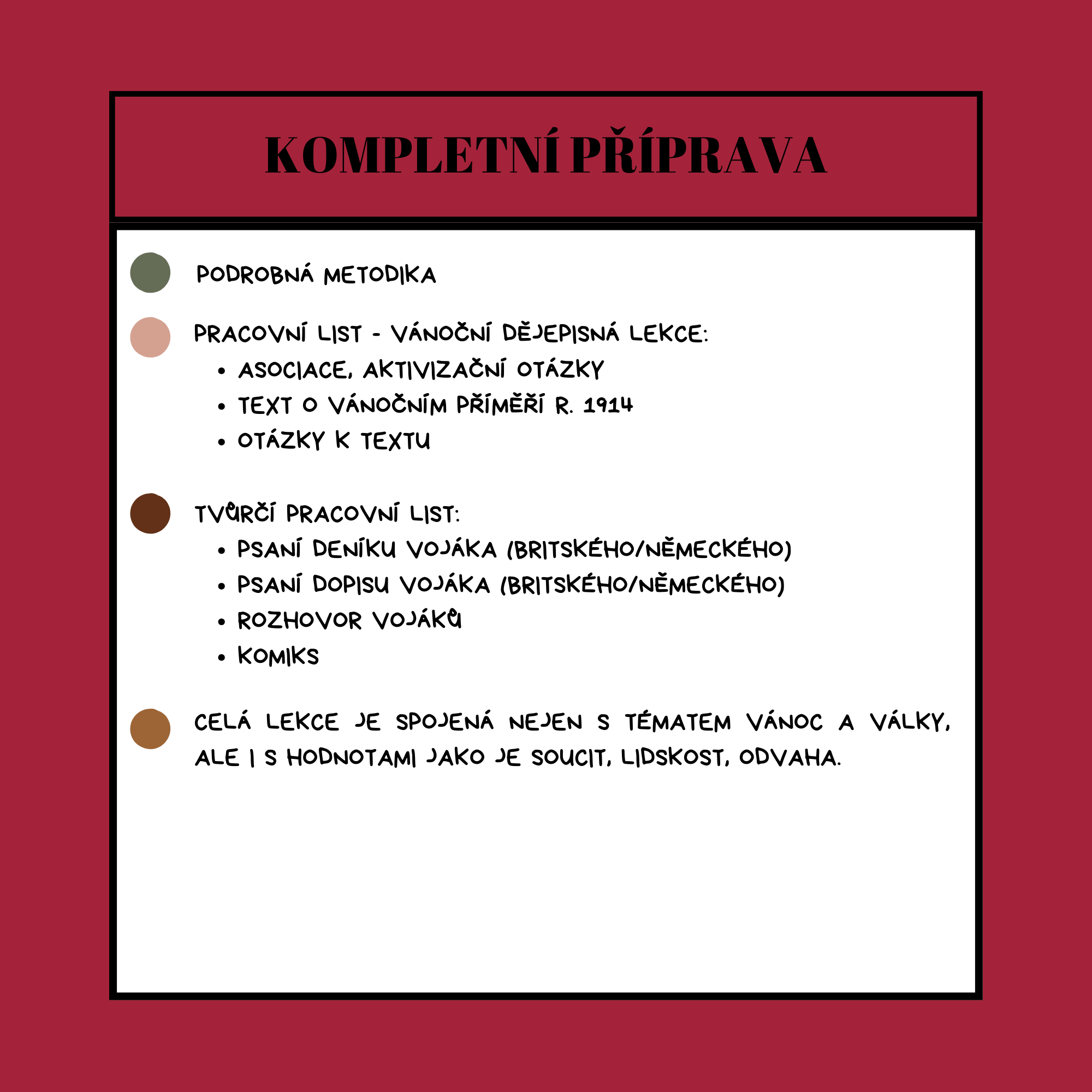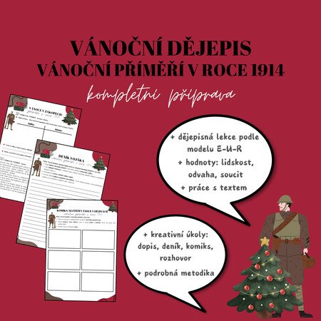 V rámci této dějepisné lekce žák pracuje s událostí, která se stala na Štědrý den za 1. světové války. Tato lekce pracuje nejen s tématem Vánoc a války, ale i s hodnotami jako je soucit, lidskost, odvaha.