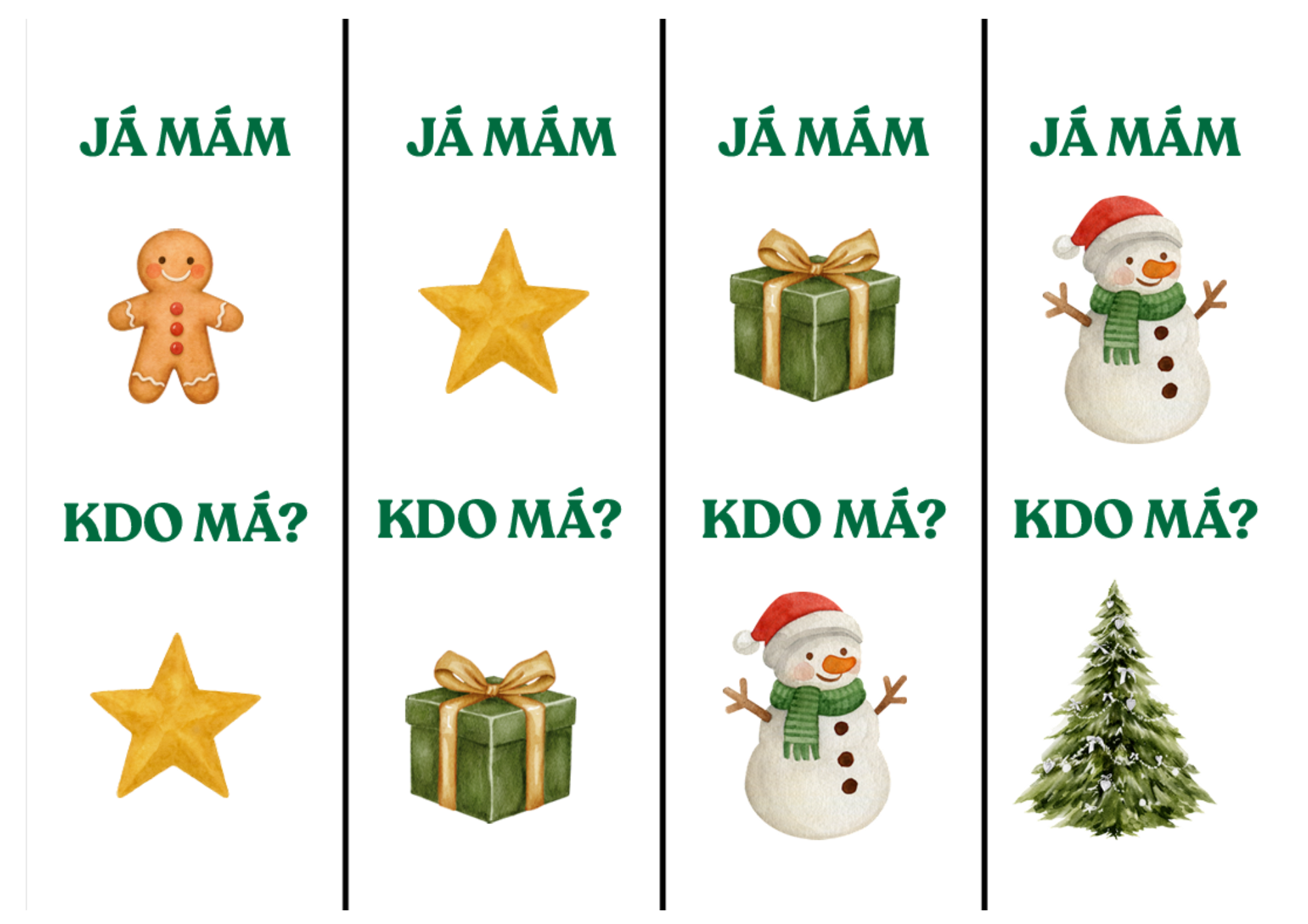 V souboru naleznete 16 karet pro hru Já mám - kdo má? s vánoční tematikou. Karty náhodně rozdáme dětem a děti se vždy pomocí obrázku doptávají a hledají kamaráda s navazující kartičkou. Např. první dítě: “Já mám perníček, kdo má hvězdu?” další dítě: “Já mám hvězdu, kdo má dárek?”