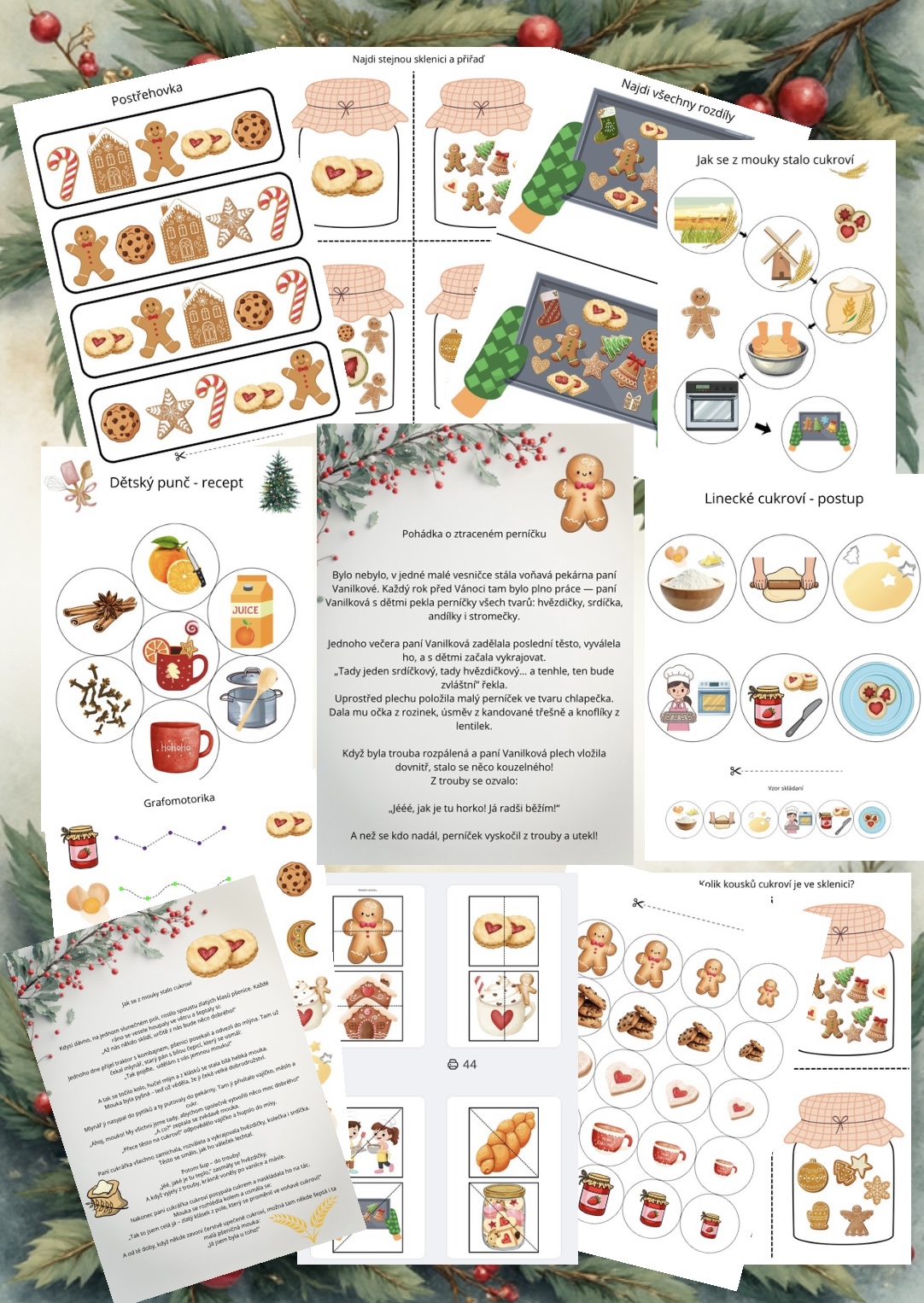 Soubor obsahuje aktivity a ilustrace k tématu vánočního pečení pro děti v mateřské škole. Najdete zde jednoduché recepty, obrázkový postup pečení, náměty na hry a pracovní listy. Materiál rozvíjí dětskou představivost, jemnou motoriku i spolupráci.