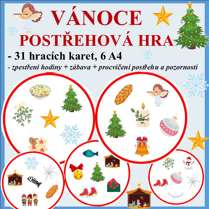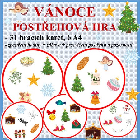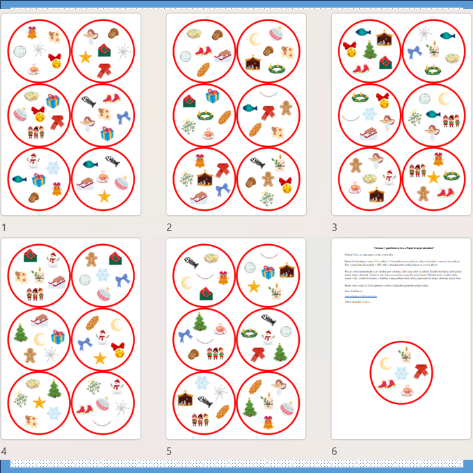 Materiál obsahuje 6 stran A4 s celkem 31 kartičkami na nichž je vždy 6 obrázků s vánoční tematikou. Hru využijí hlavně učitelé v MŠ, děti v družině nebo rodiče doma se svými dětmi.