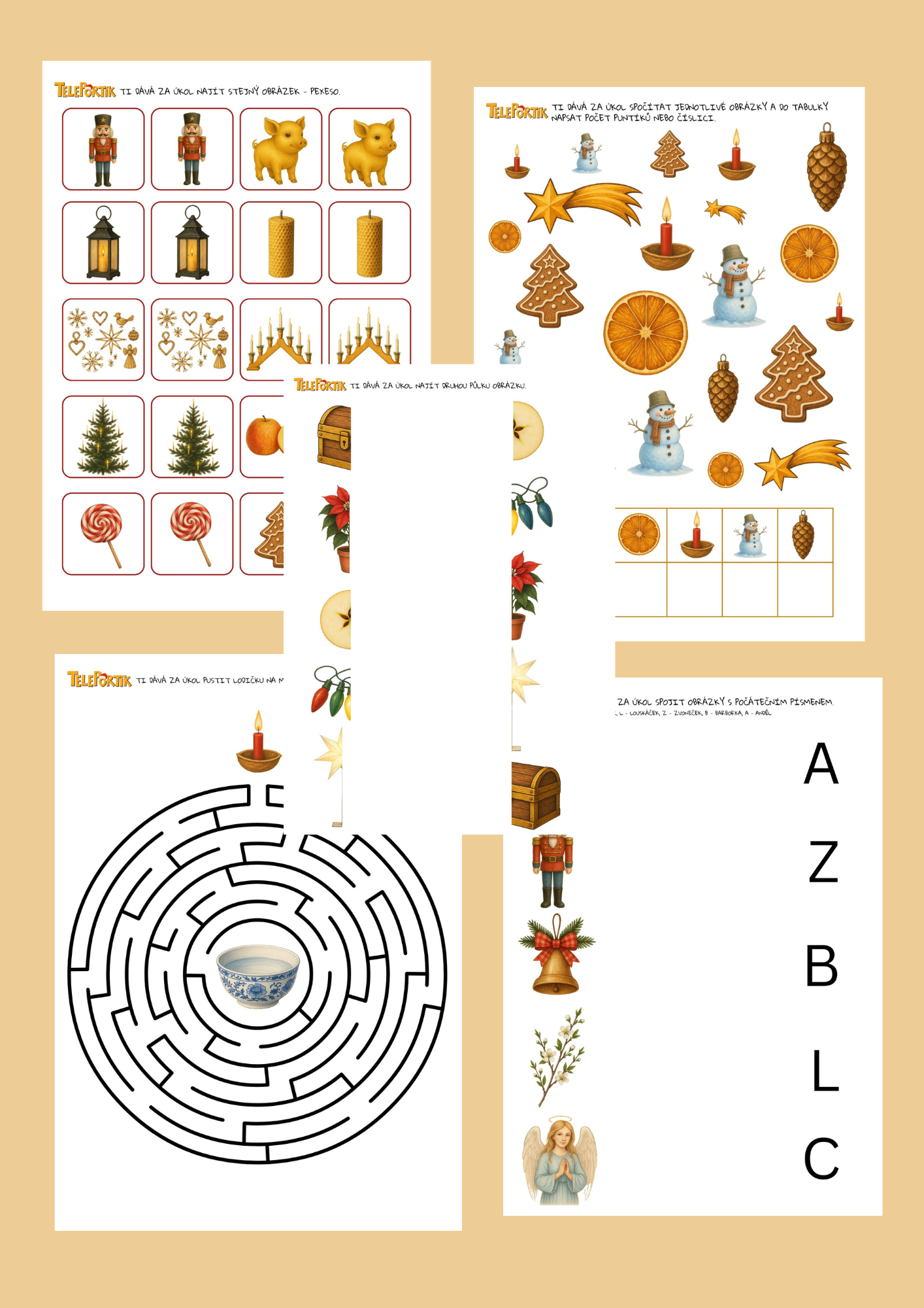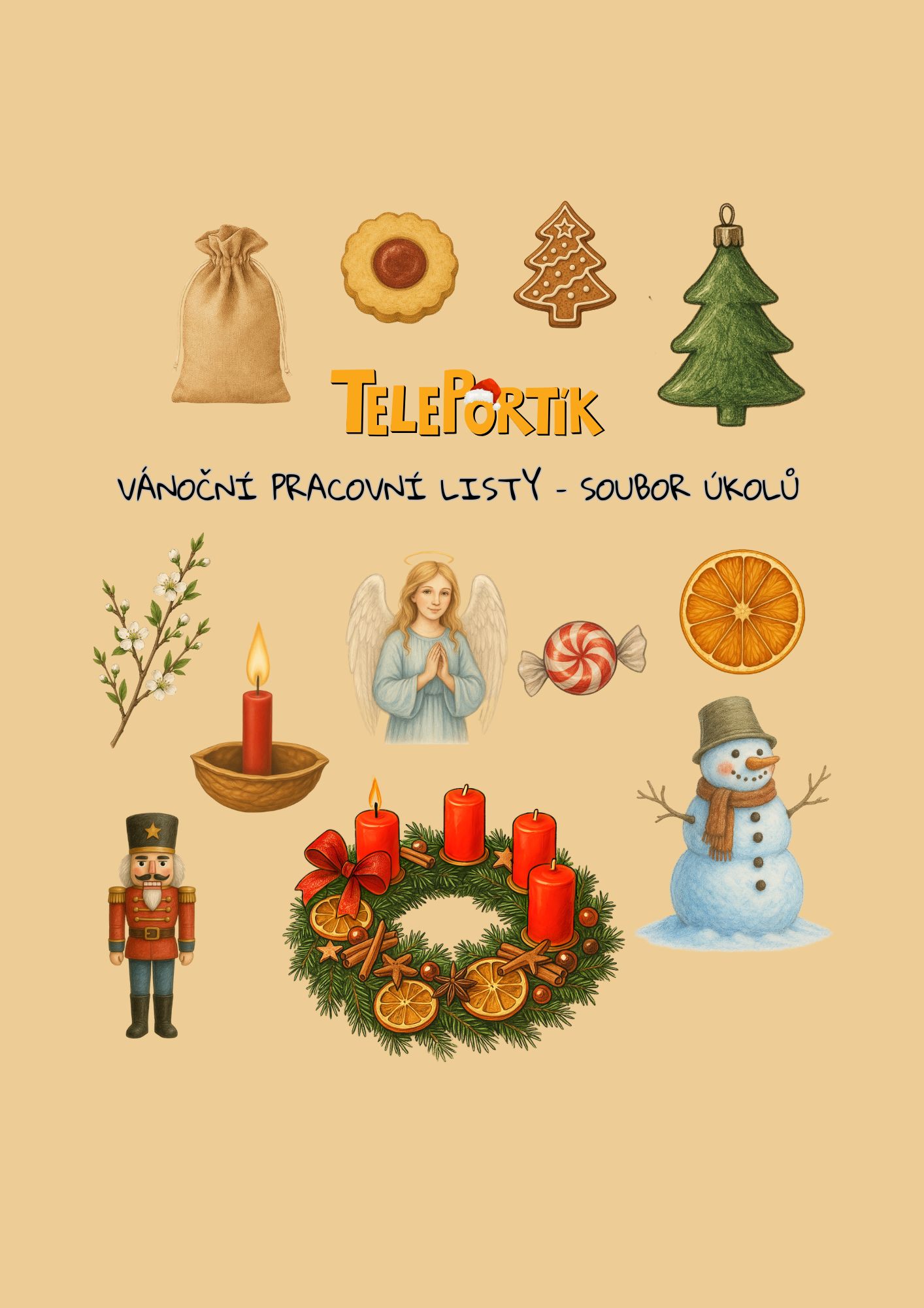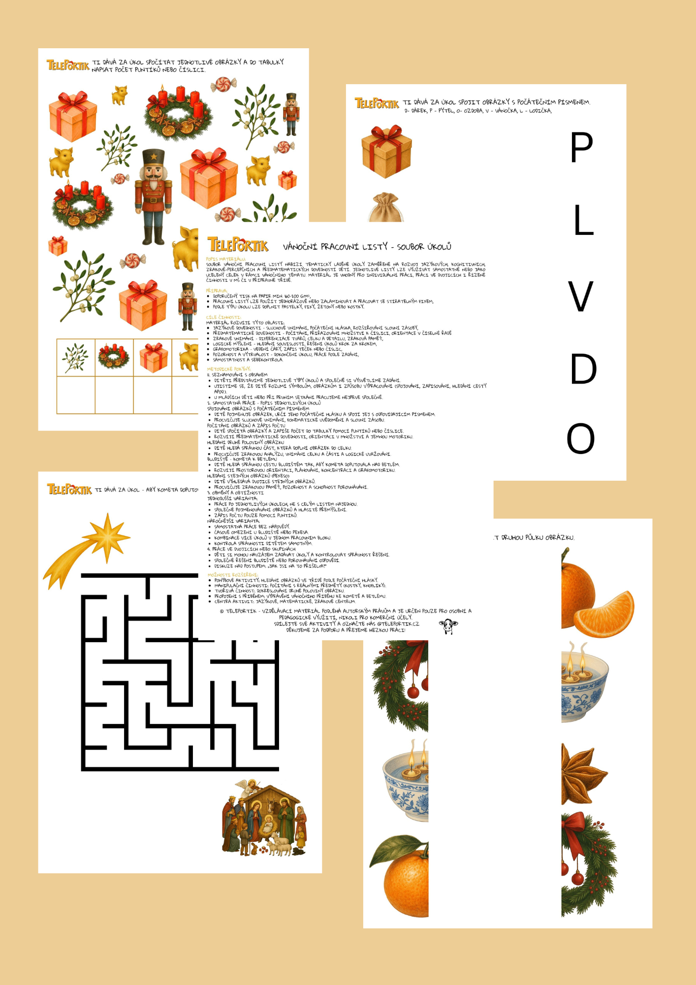 Soubor Vánoční pracovní listy nabízí tematicky laděné úkoly zaměřené na rozvoj jazykových, kognitivních, zrakově-percepčních a předmatematických dovedností dětí. Jednotlivé listy lze využívat samostatně nebo jako ucelený celek v rámci vánočního tématu. Materiál je vhodný pro individuální práci, práci ve dvojicích i řízené činnosti v MŠ či v přípravné třídě.