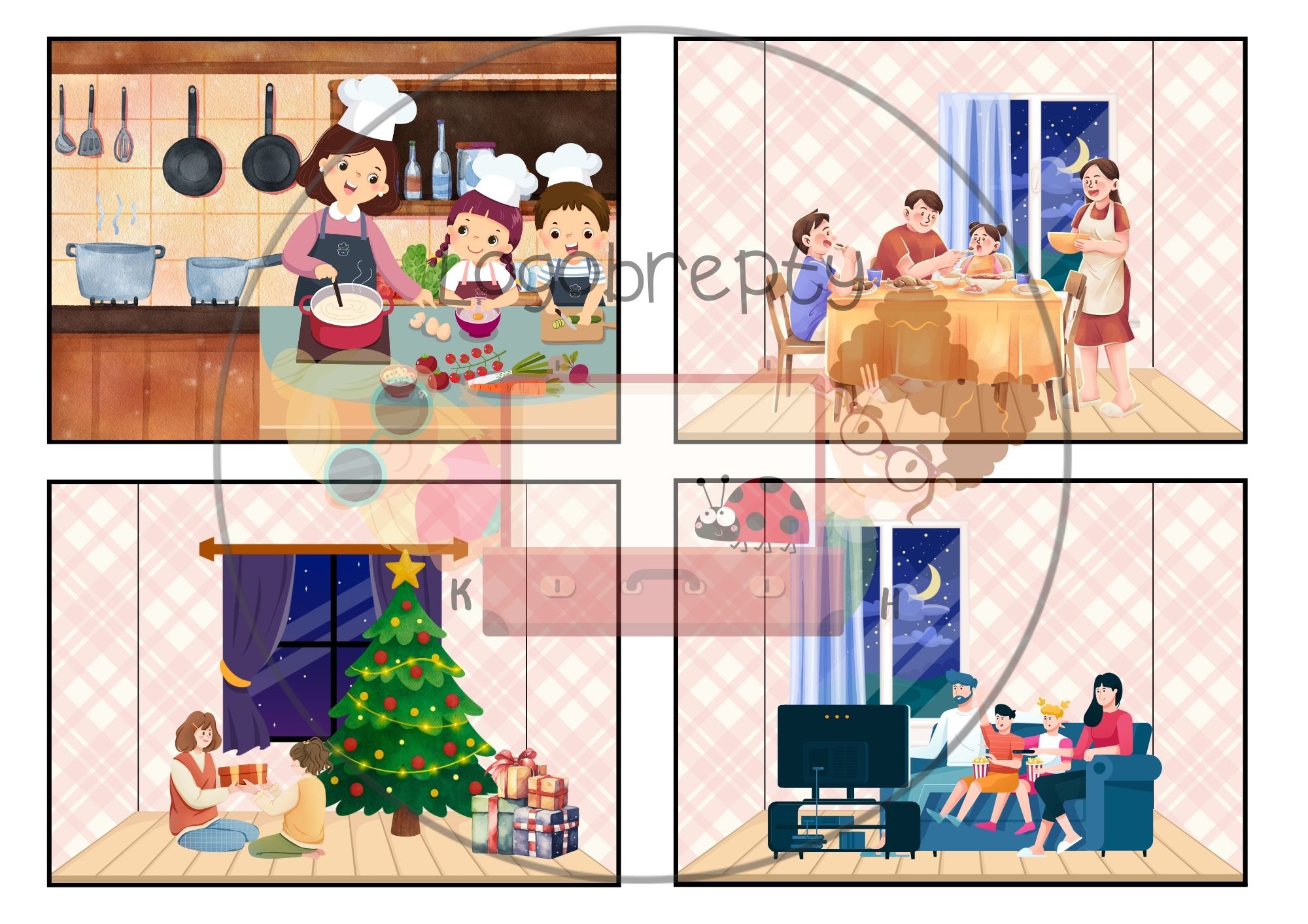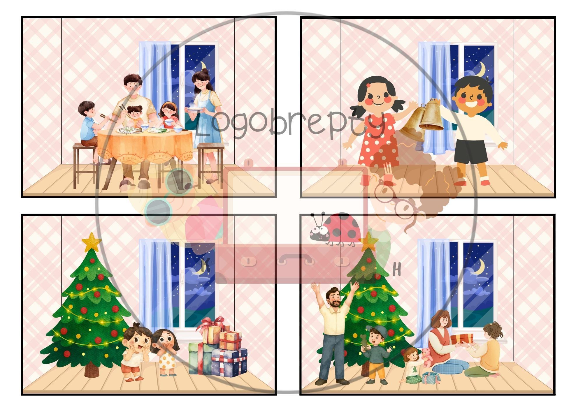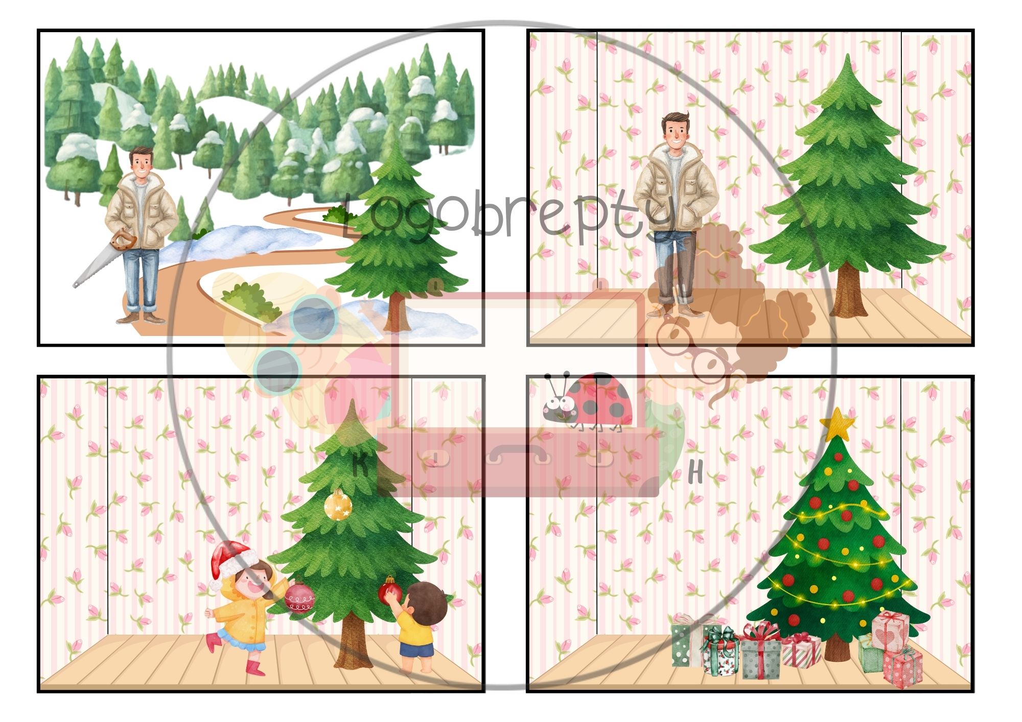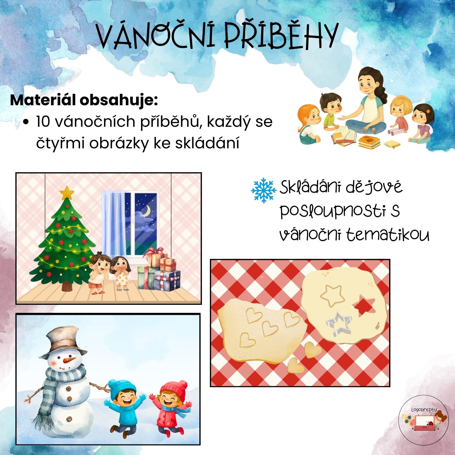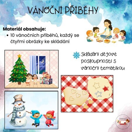 Tato pomůcka obsahuje 10 krátkých příběhů, z nichž každý je zachycen ve čtyřech obrázcích s vánoční tematikou. Úkolem dítěte je seřadit ilustrace do správného pořadí a následně příběh převyprávět jednoduchými větami. Materiál se hodí pro individuální práci, práci ve dvojici i skupinovou aktivitu. Skvěle poslouží při logopedických cvičeních, tréninku vyjadřování i jako motivace k spontánnímu vyprávění.